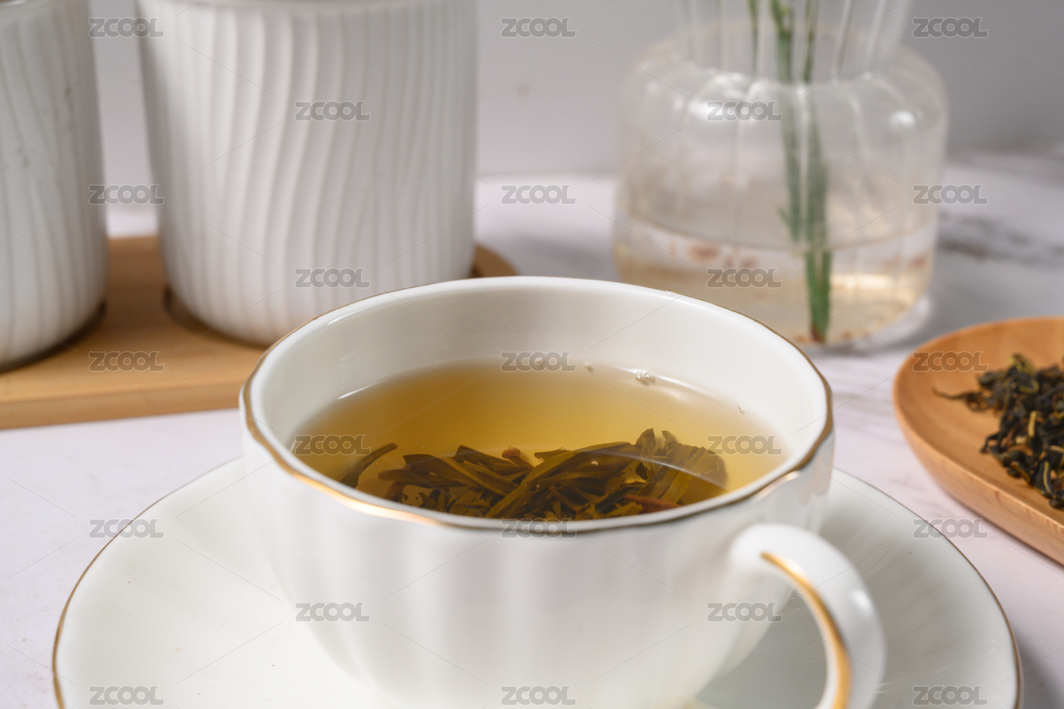 桌面上的杯子里的甘甜可口的茉莉吐珠茶