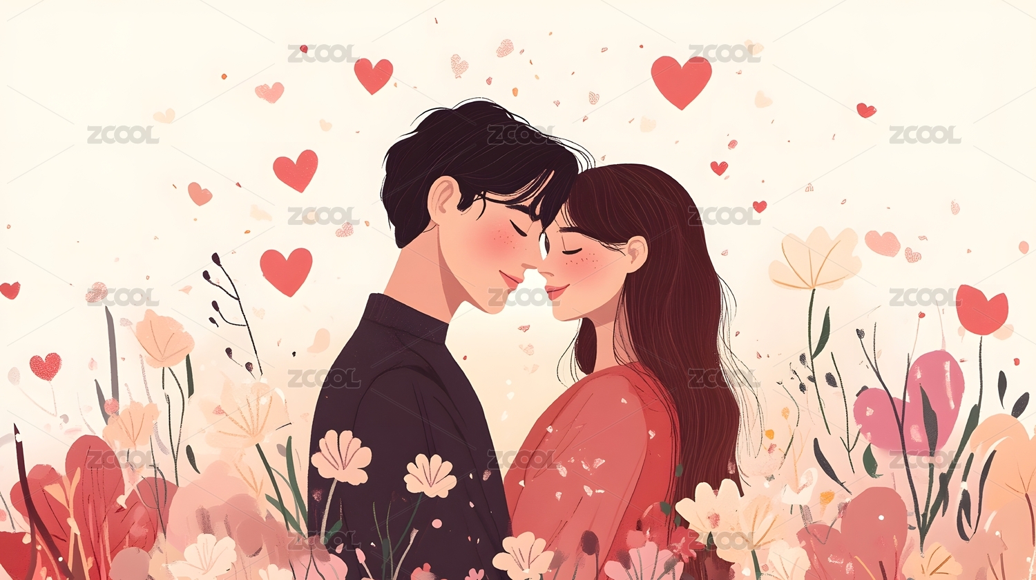 女人,插画,男人,愉悦,情人节,情侣,爱人,亲吻,牵手,花朵