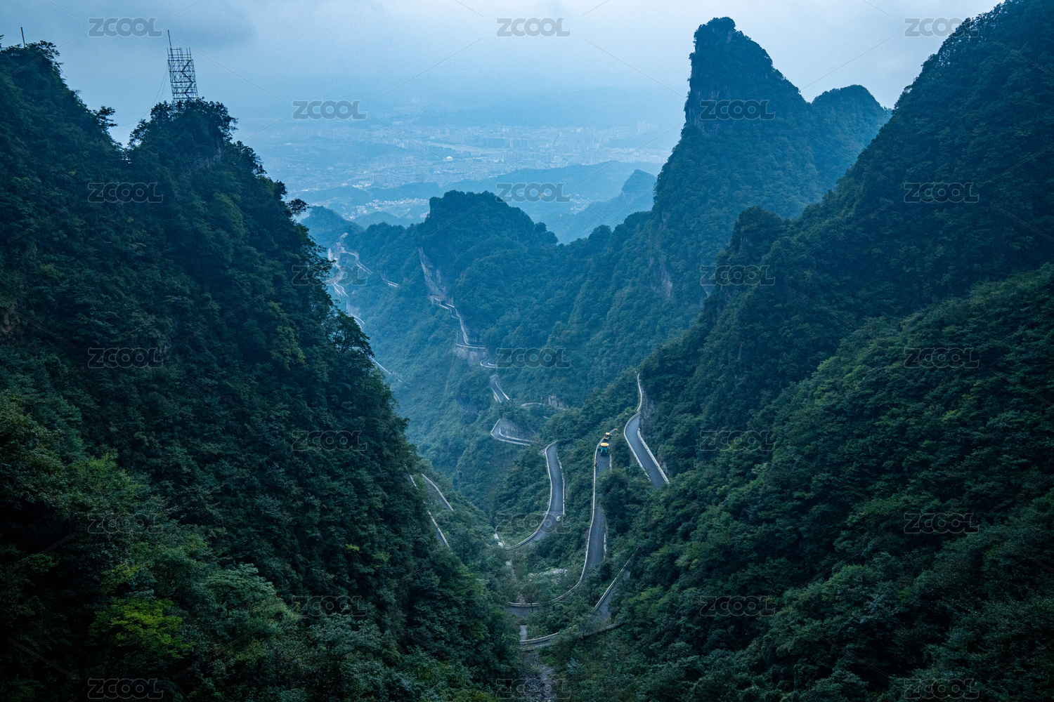 夕阳下的中国湖南张家界天门山景区的群山和弯弯曲曲的险峻山路