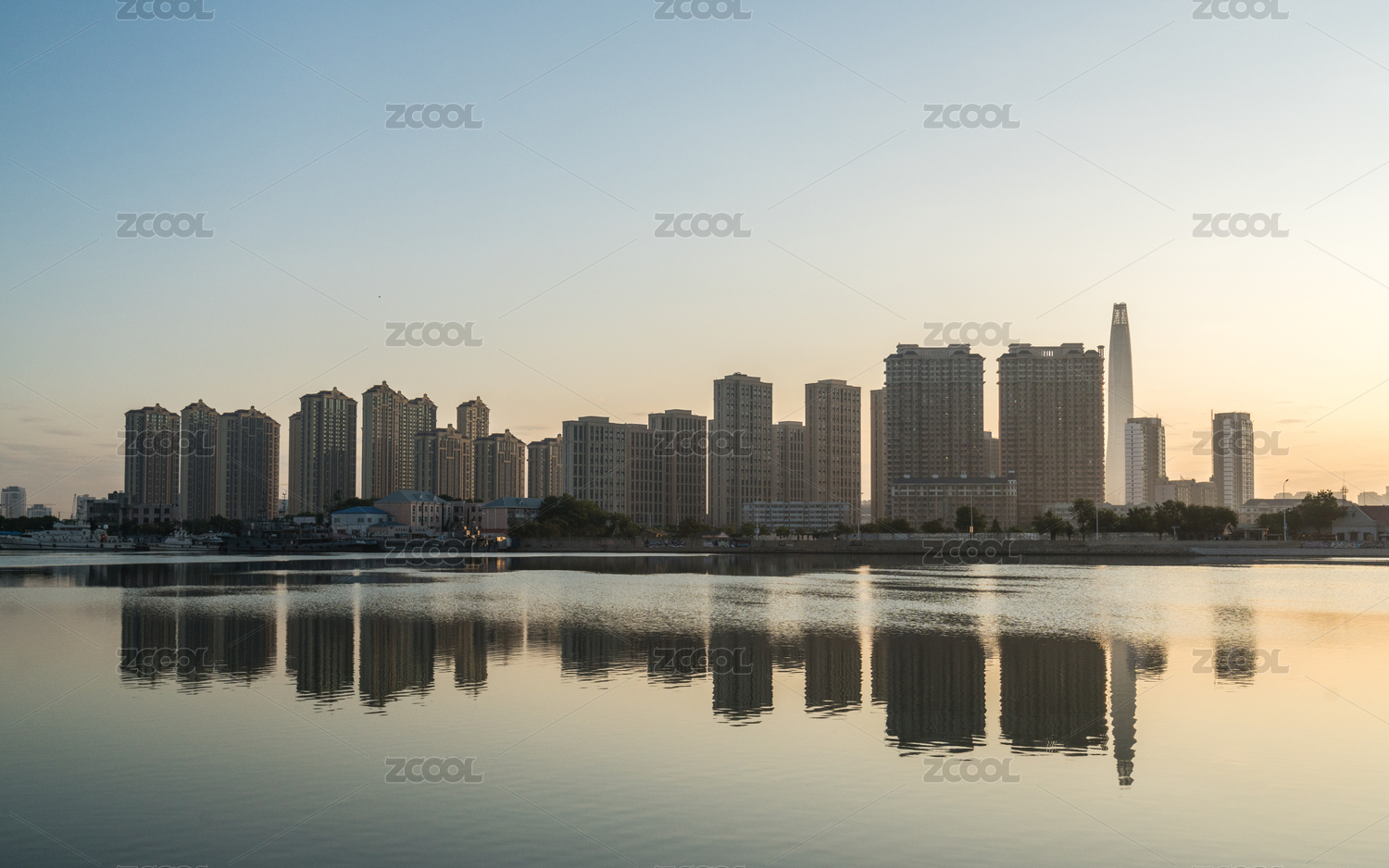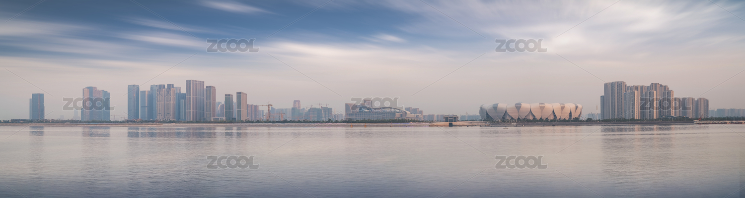 中国武汉的长江和湖泊与现代城市建筑天际线全景