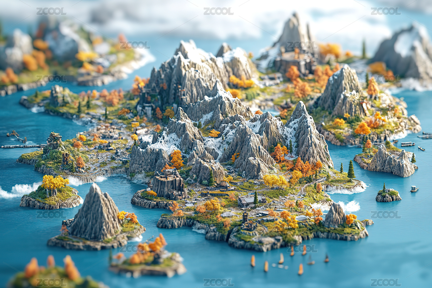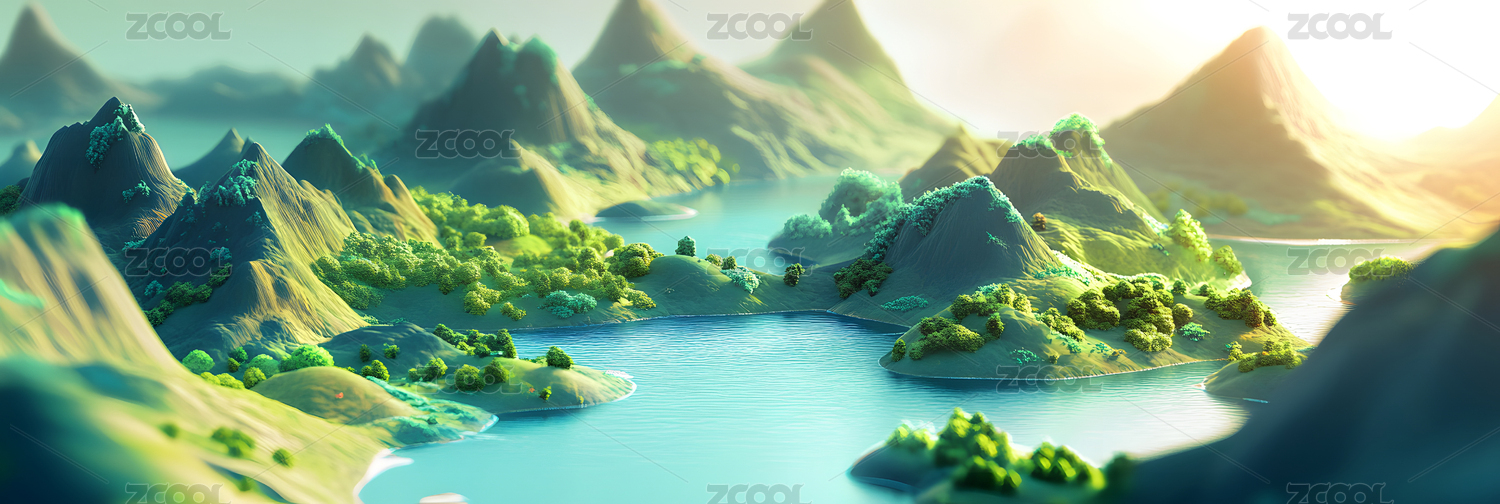 3D风格雪山森林湖泊素材