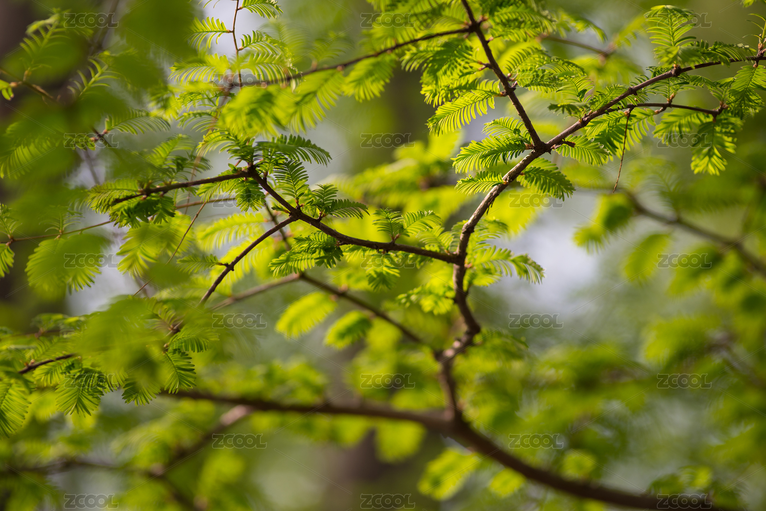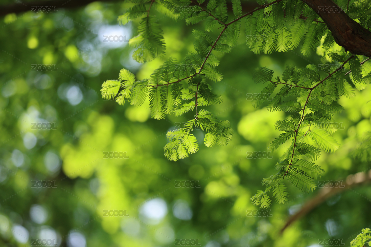 春天阳光下的绿色水杉枝叶逆光仰拍特写