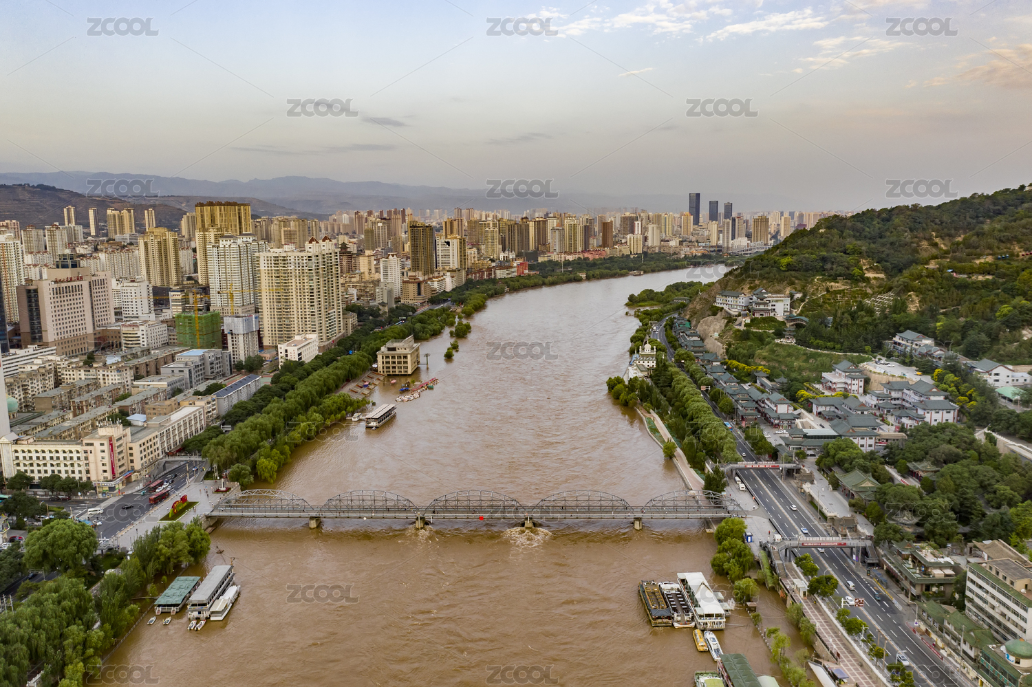 中国,甘肃,兰州,黄河,白塔山公园,夕阳,日落,晚霞,云层,航拍全景