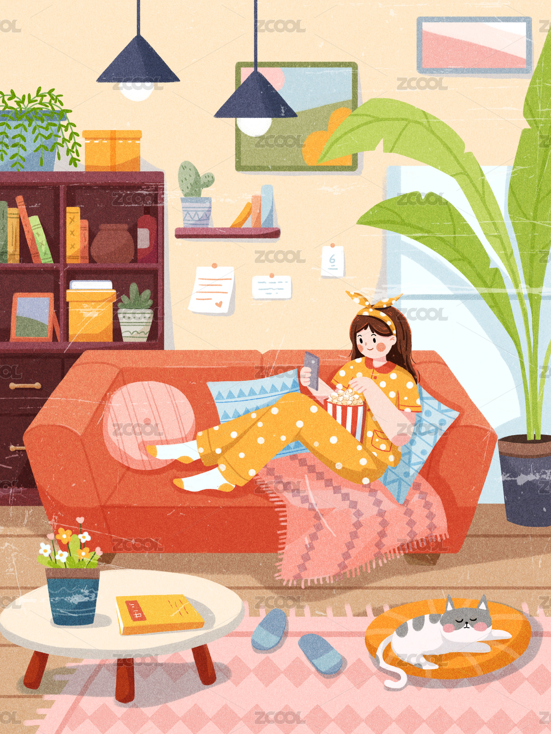穿着睡衣的女孩抱着零食在沙发上玩手机