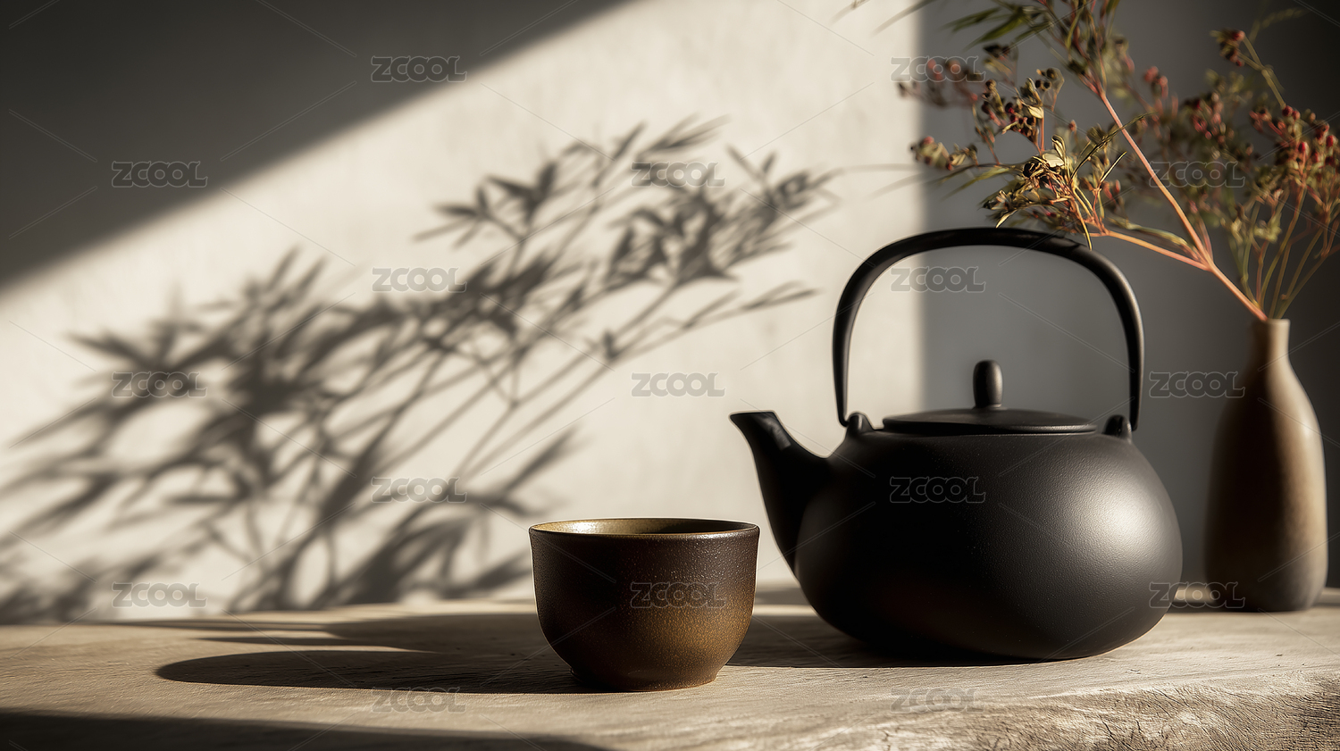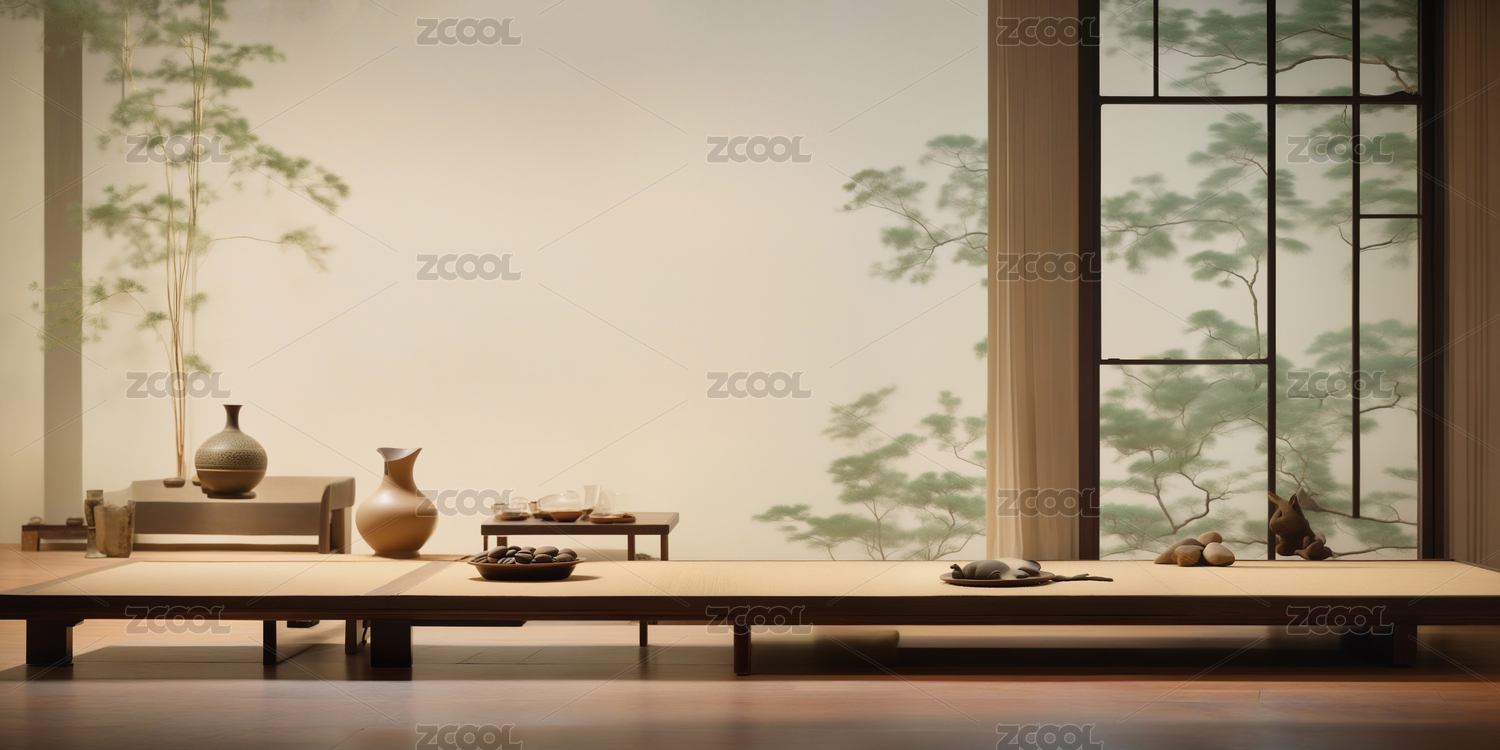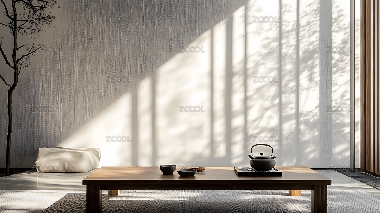 日式禅意风格木茶几和茶具室内空间