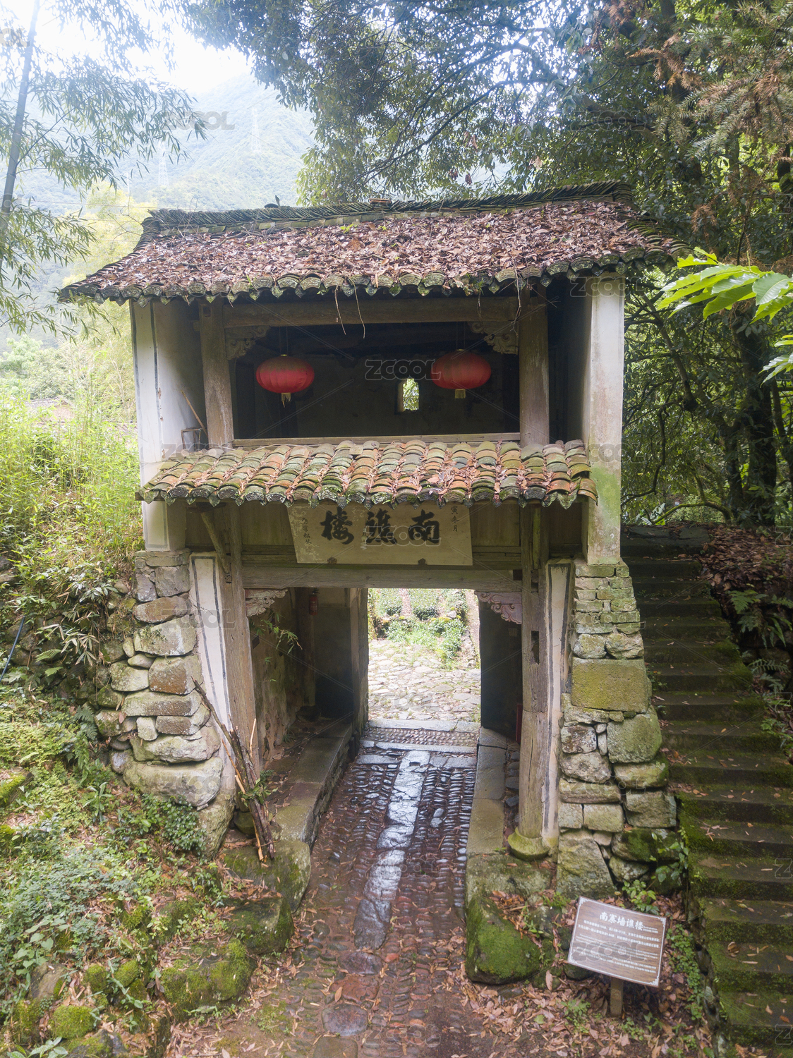 破旧木结构房屋前的青砖拱门,中国福建连城