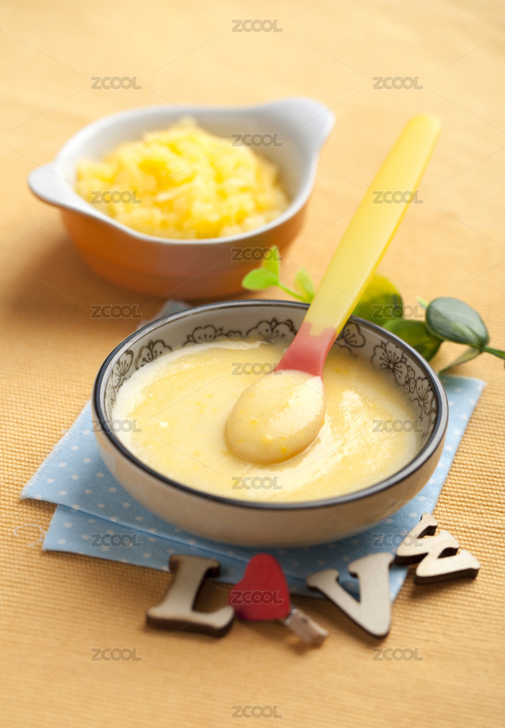 盛着小米南瓜粥的彩色瓷碗放在木桌上