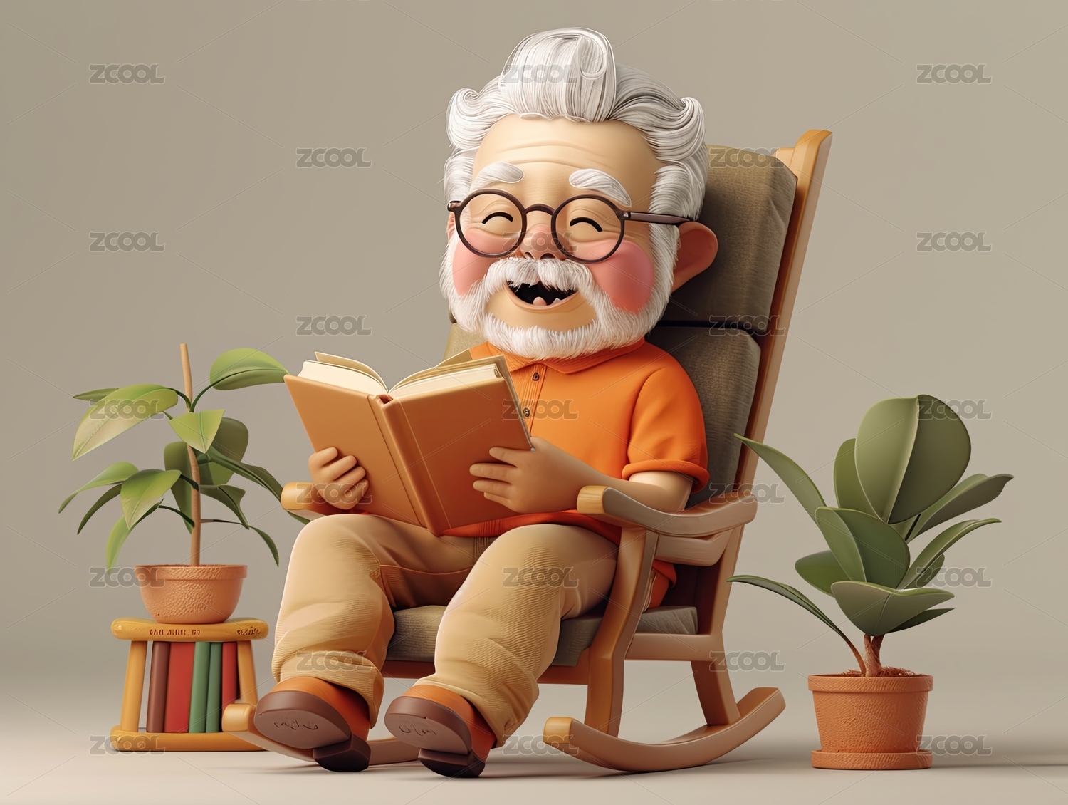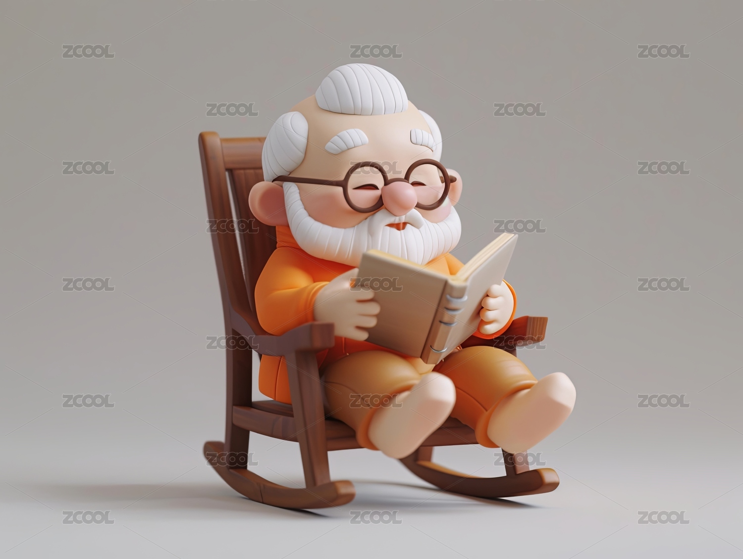爷爷坐在摇椅上看书,退休老人悠闲生活概念