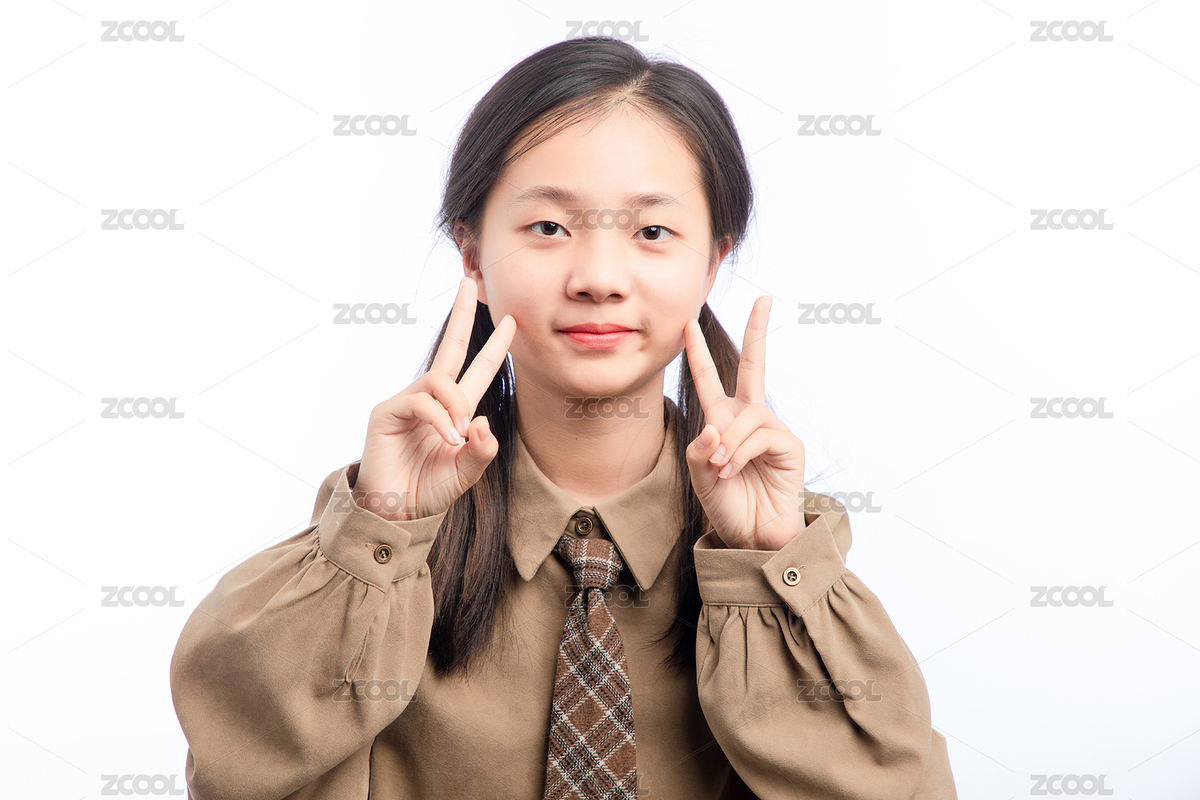 白色背景里,举着剪刀手手势的亚洲小女孩