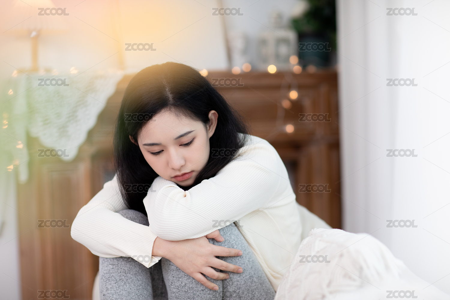 一个女孩坐在沙发上抱着自己心情低落