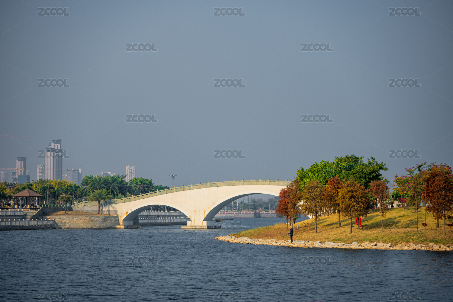 福建厦门马銮湾公园城市湖畔拱桥风光