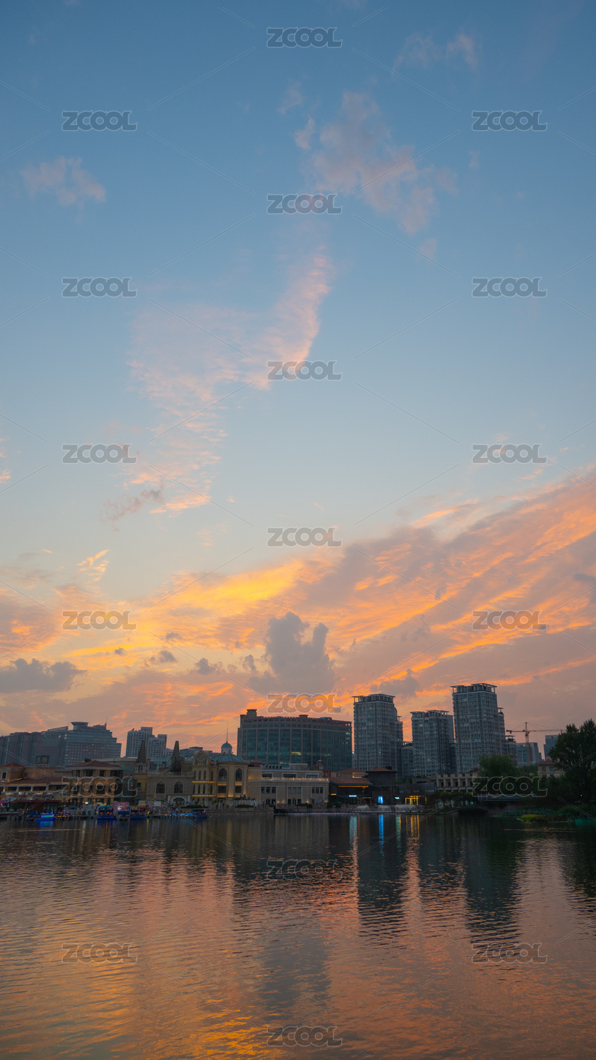 城市湖泊黄昏晚霞火烧云