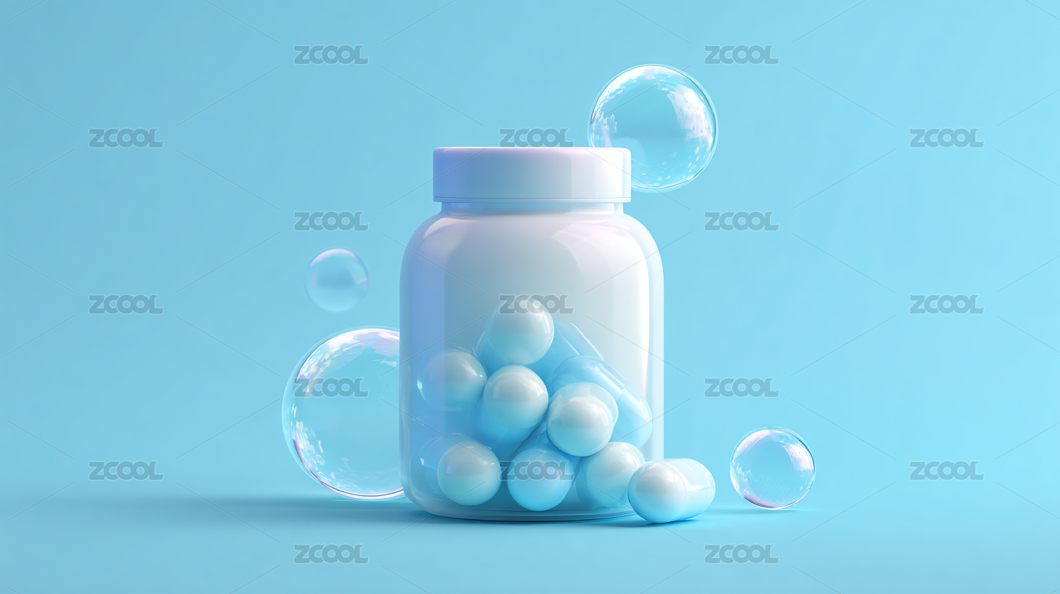 悬浮在彩色球中的白色药瓶
