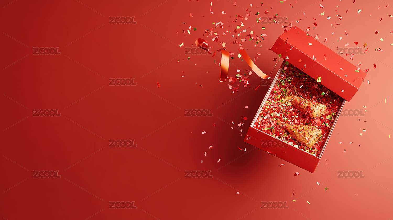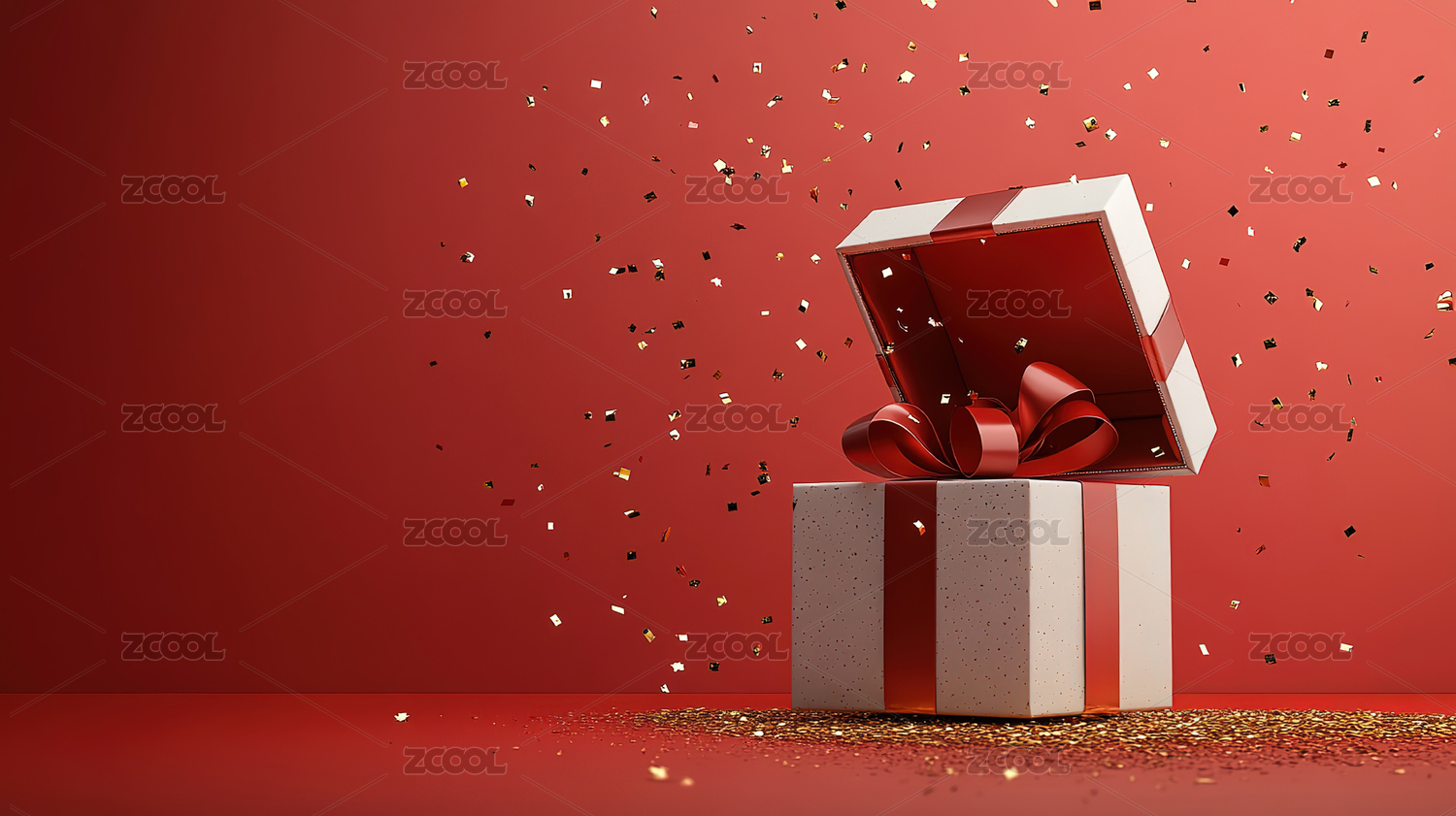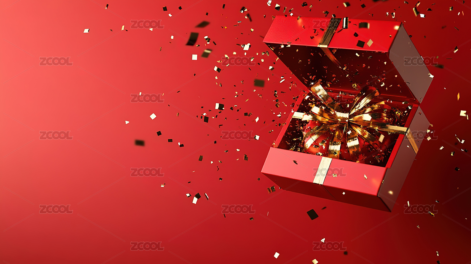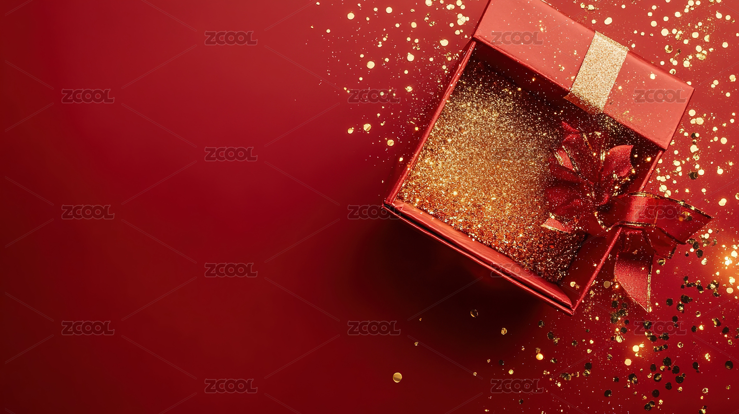 红色礼盒配红蝴蝶结,背景点缀闪光。