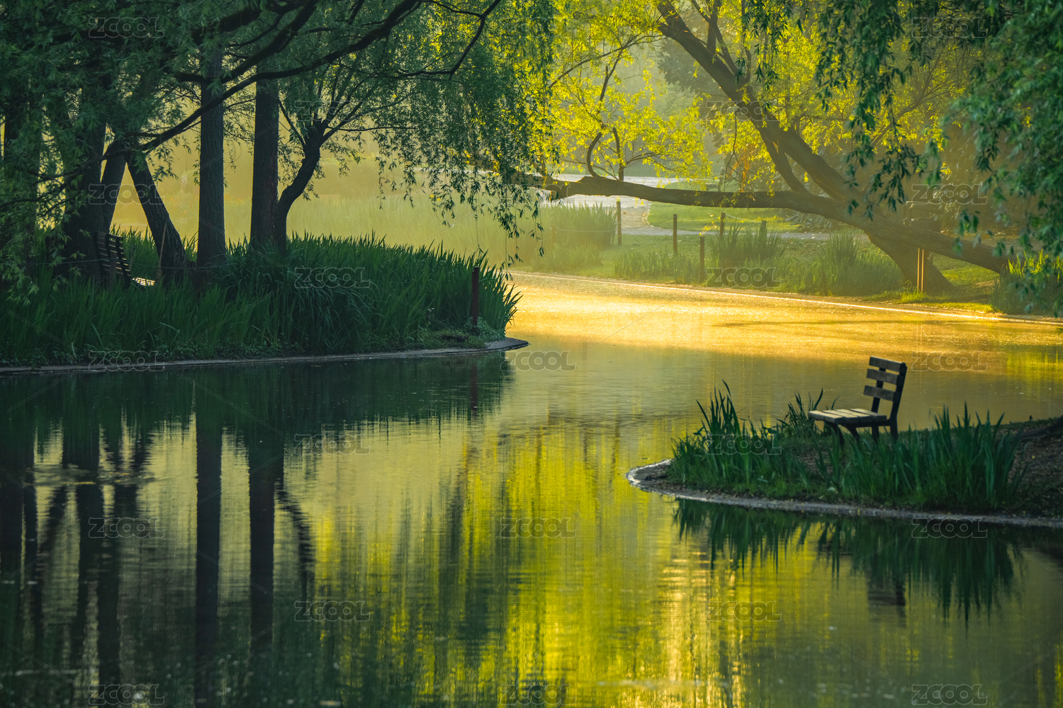 阳光下湖畔柳荫下的长椅