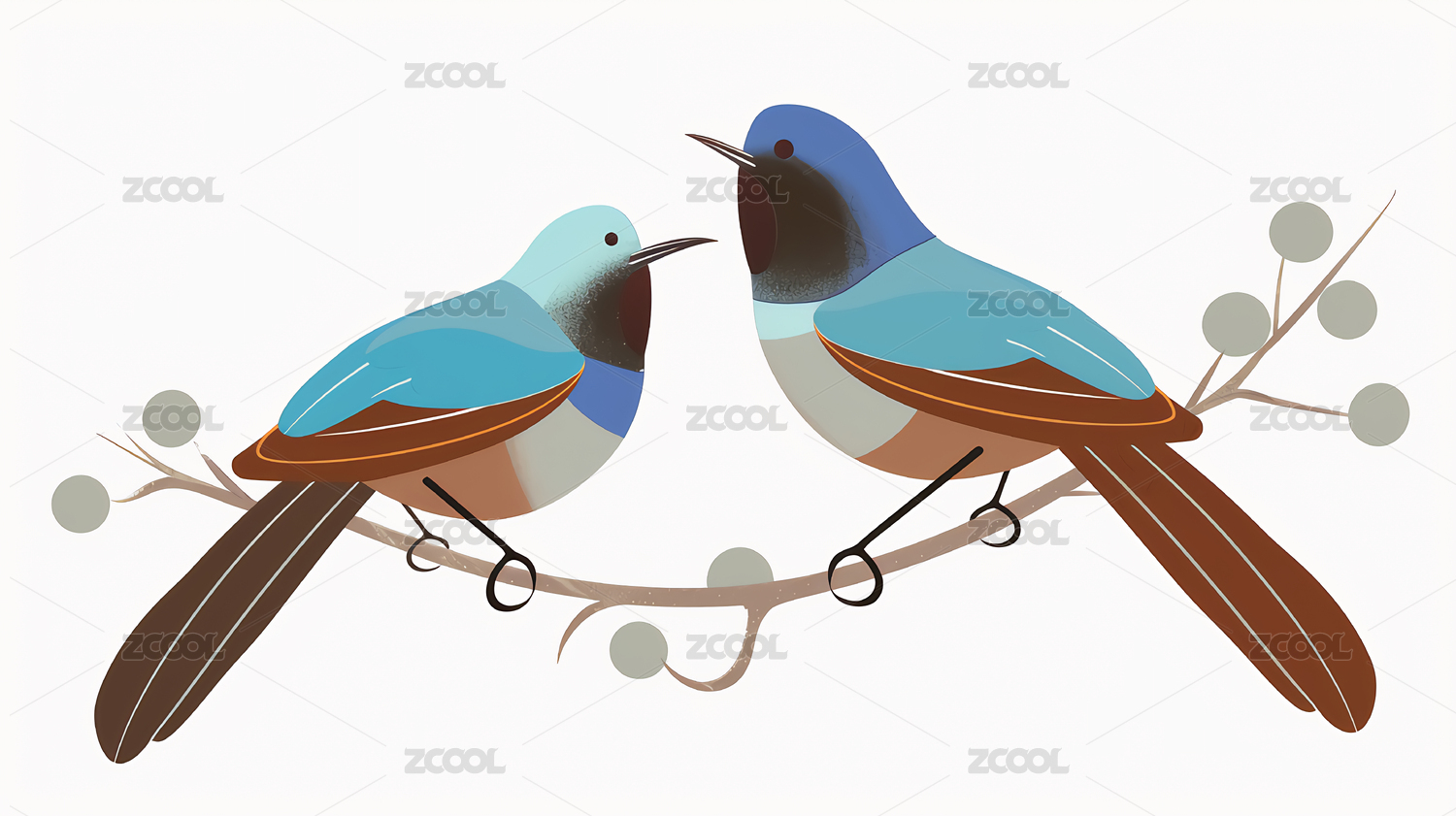 清新治愈树枝上可爱简单的彩色小鸟插画