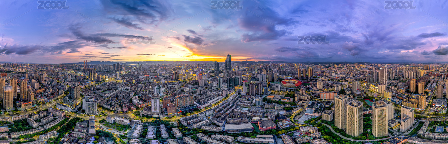 中国昆明城市市中心日落全景