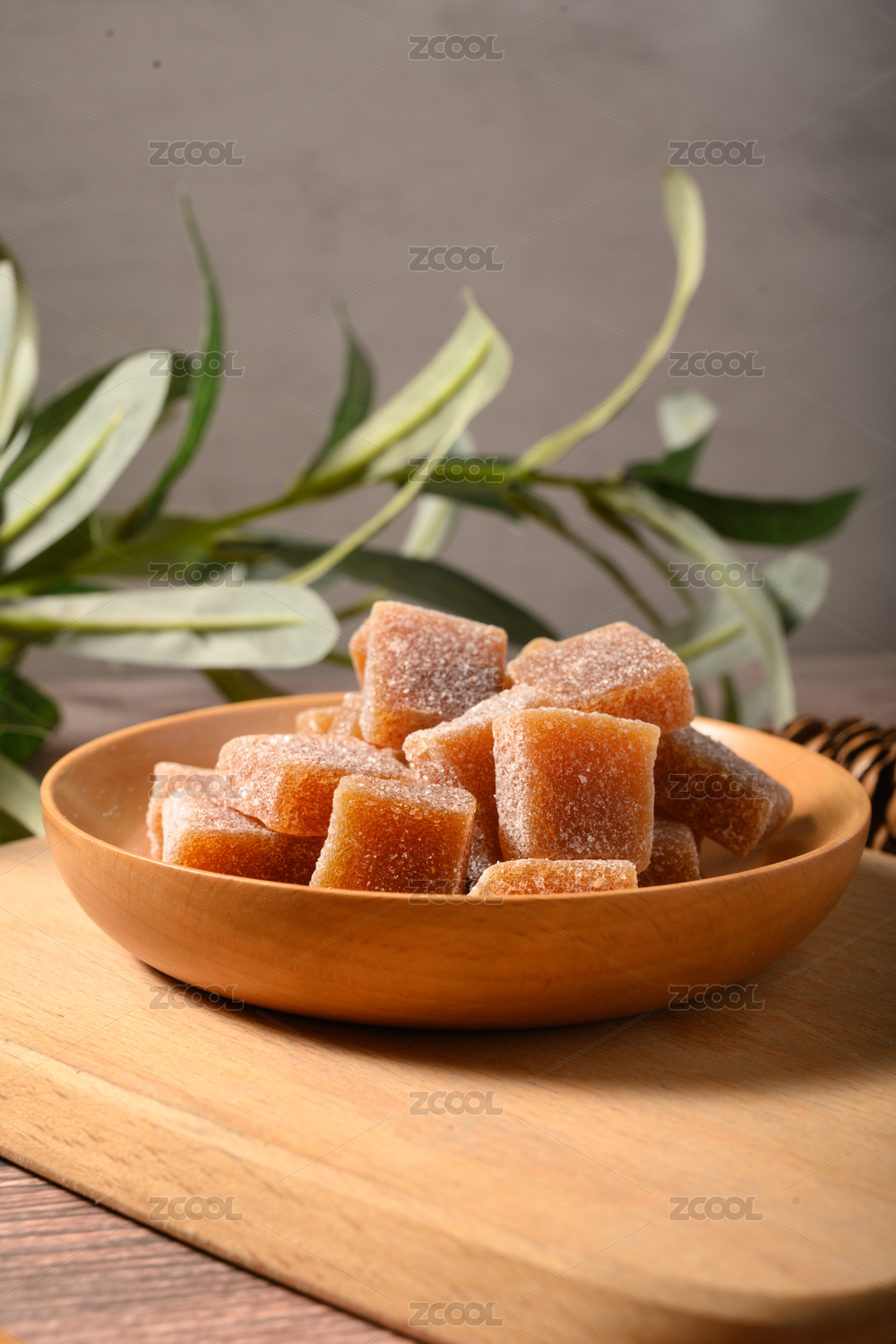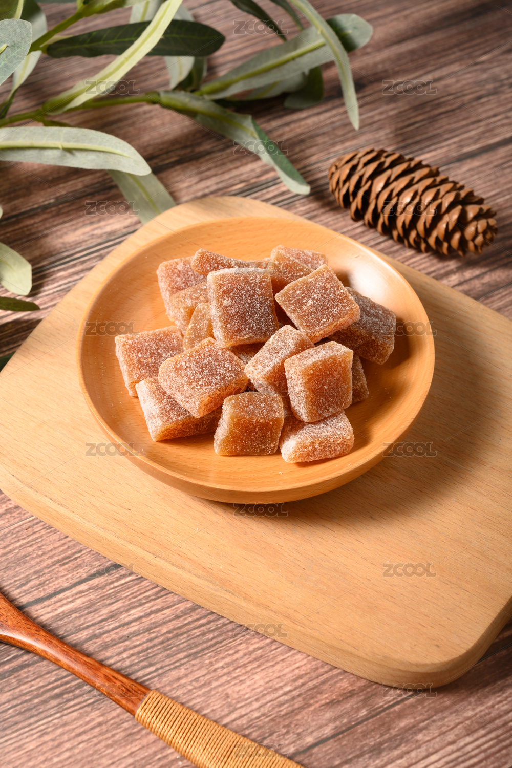 桌面上的木纹盘子里的美味可口的酵素山楂