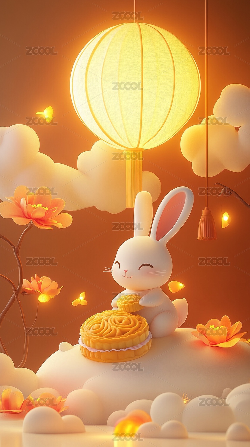中秋节夜晚玉兔手拿灯笼坐在月饼上