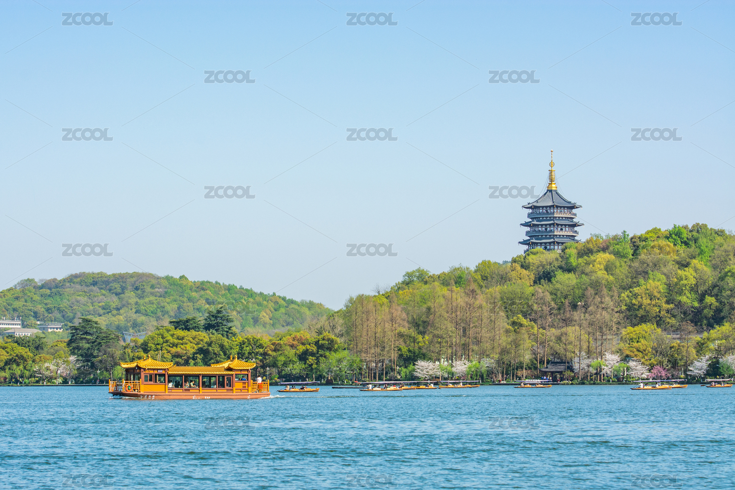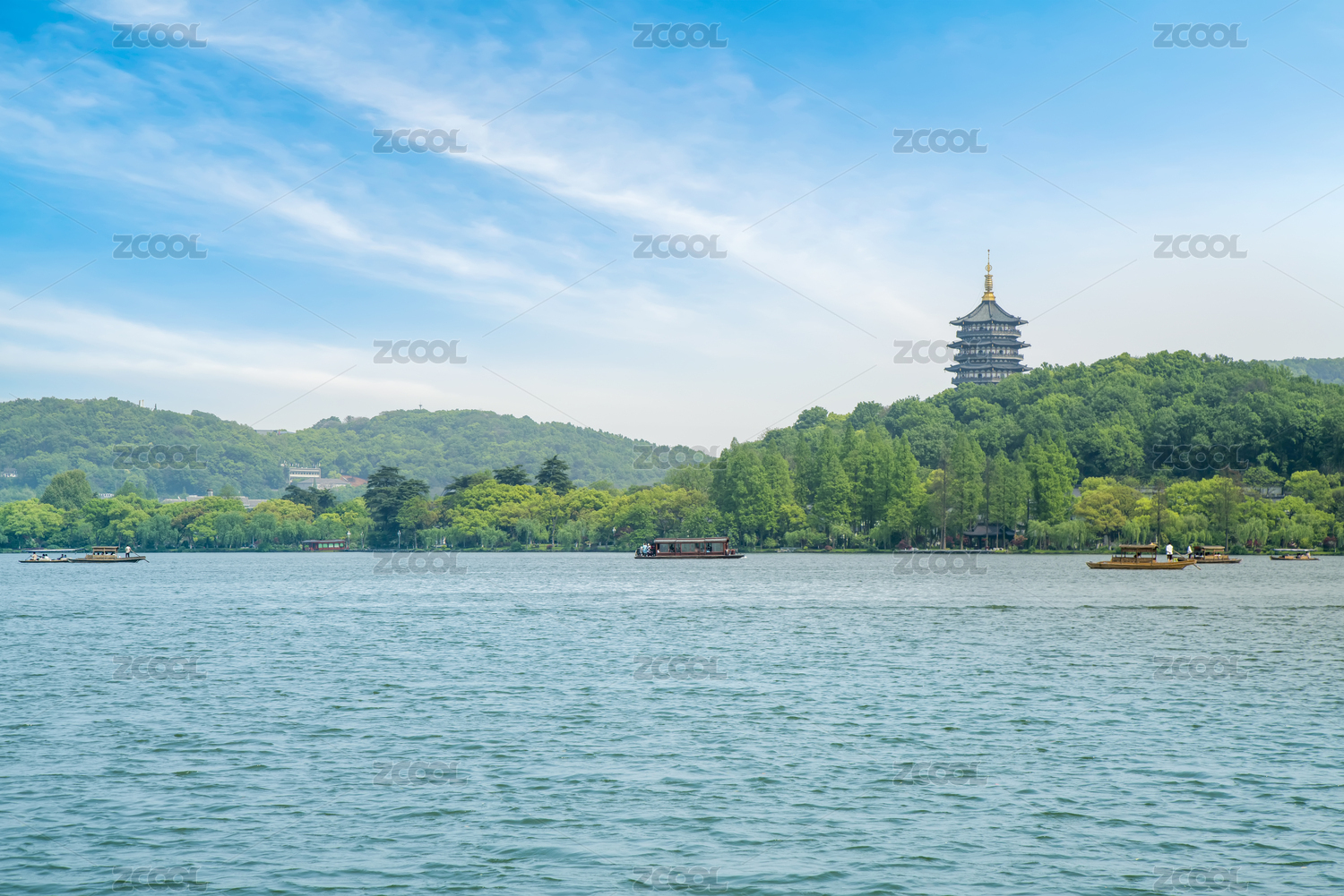 杭州西湖碧波泛舟湖上 苏堤与雷峰塔