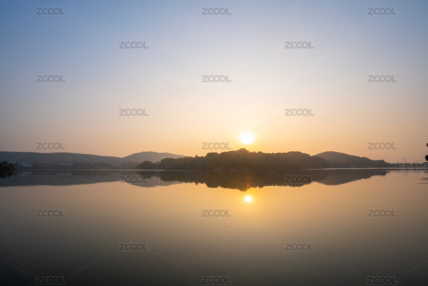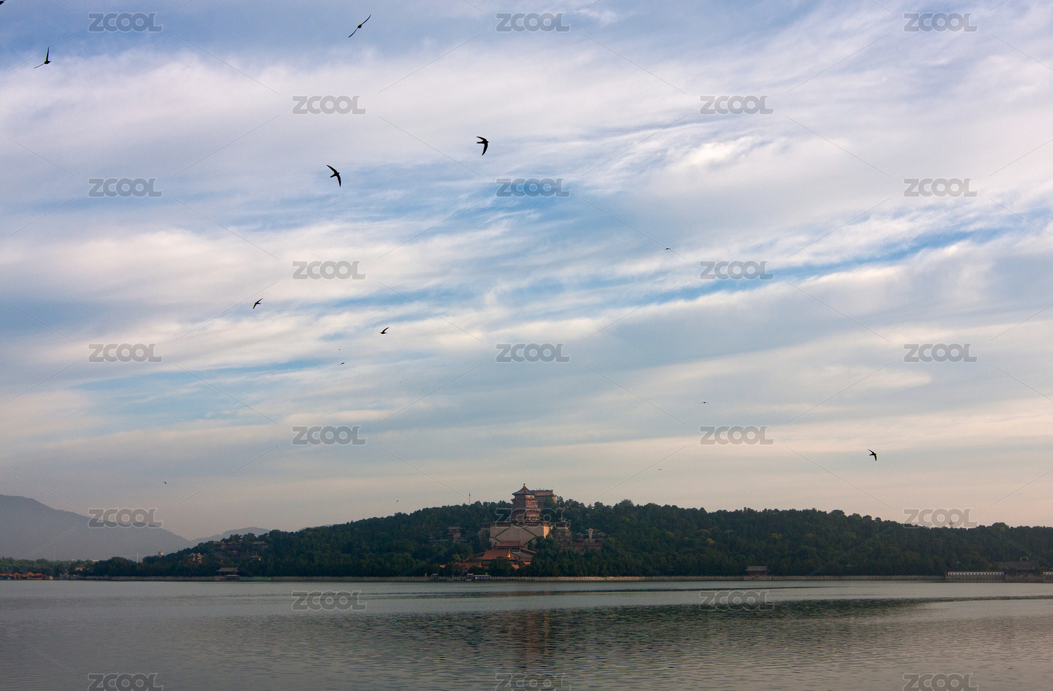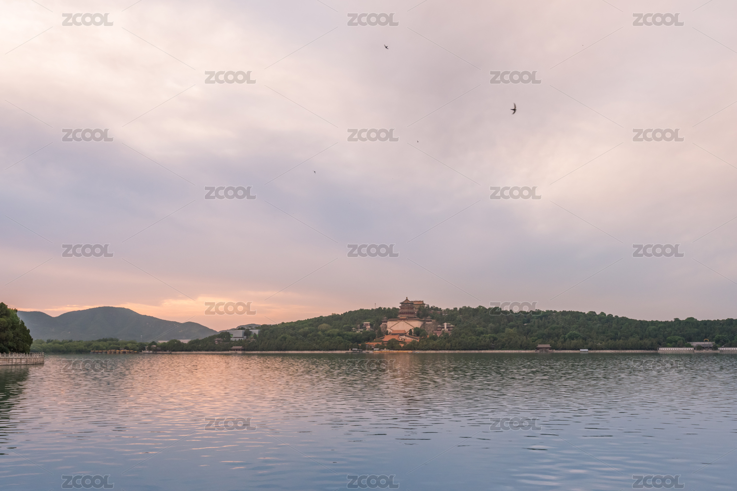 夕阳下的中国北京颐和园的湖泊园林建筑