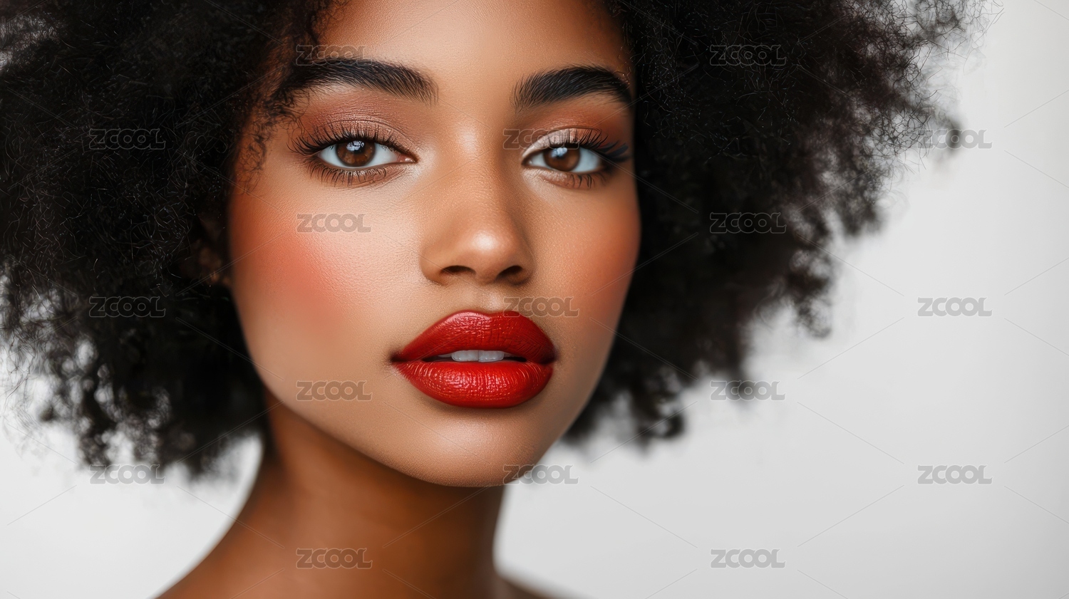 面部特写,红唇浓妆,肤色健康,眼神沉静