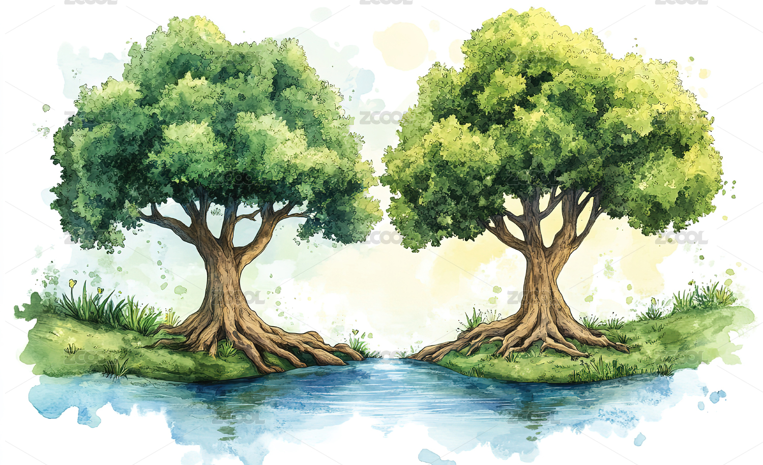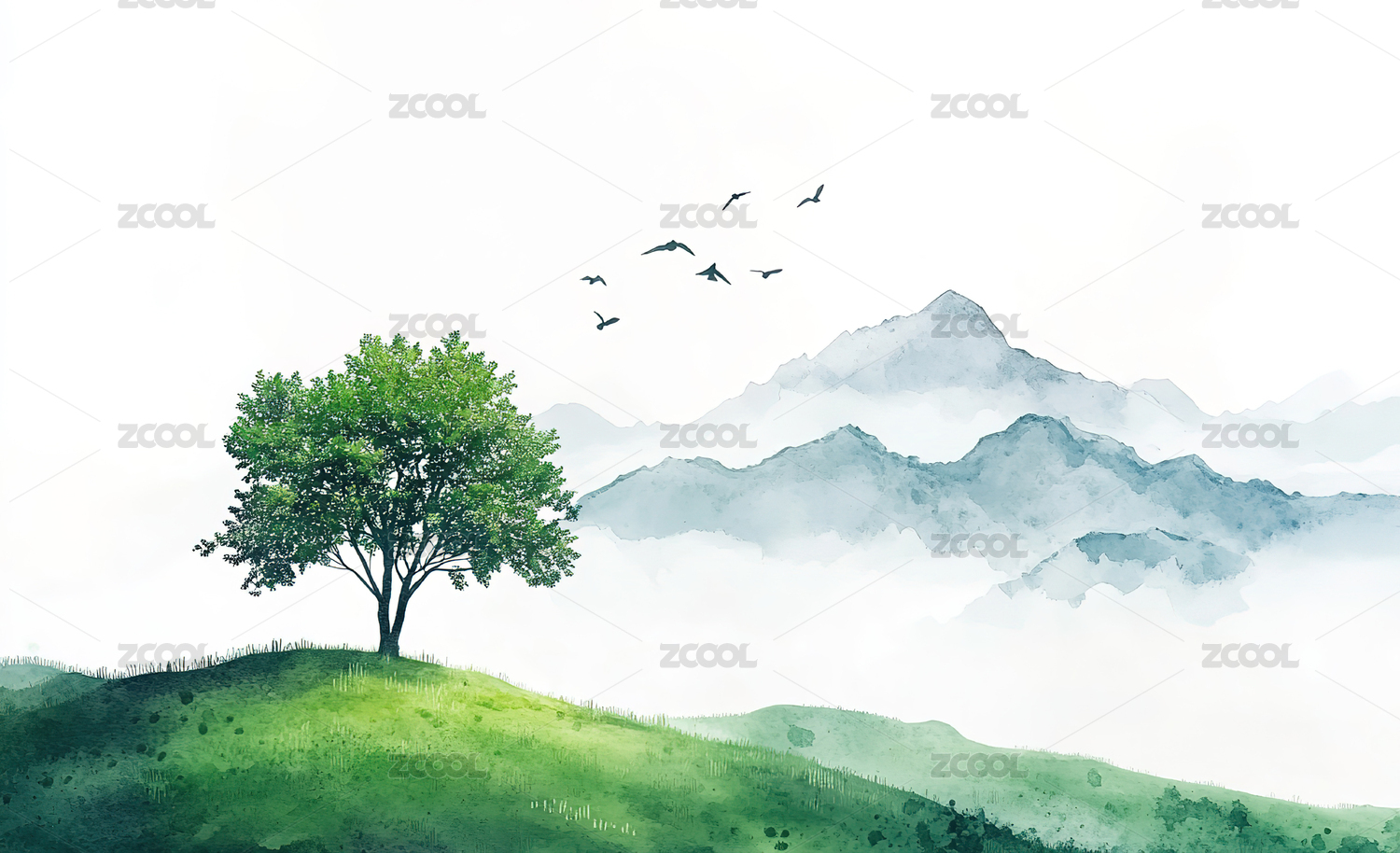 水彩风格老树风景画树木枝繁叶茂充满生机