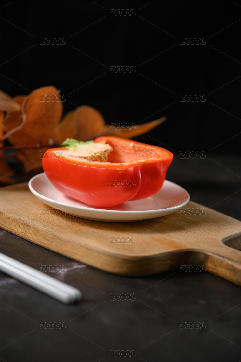 桌面上的盘子里的切开的红辣椒
