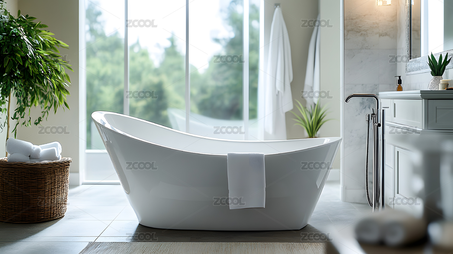 蓝色, 现代, 装饰, 浴缸, 独立式, 植物, 吊灯, 窗户, 自然光, 室内设计