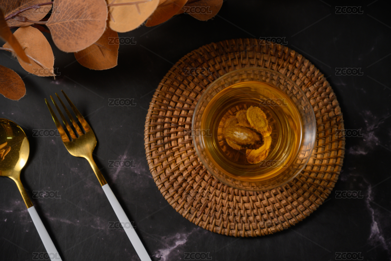 桌面上的盘子里的美味可口的陈皮三宝扎茶