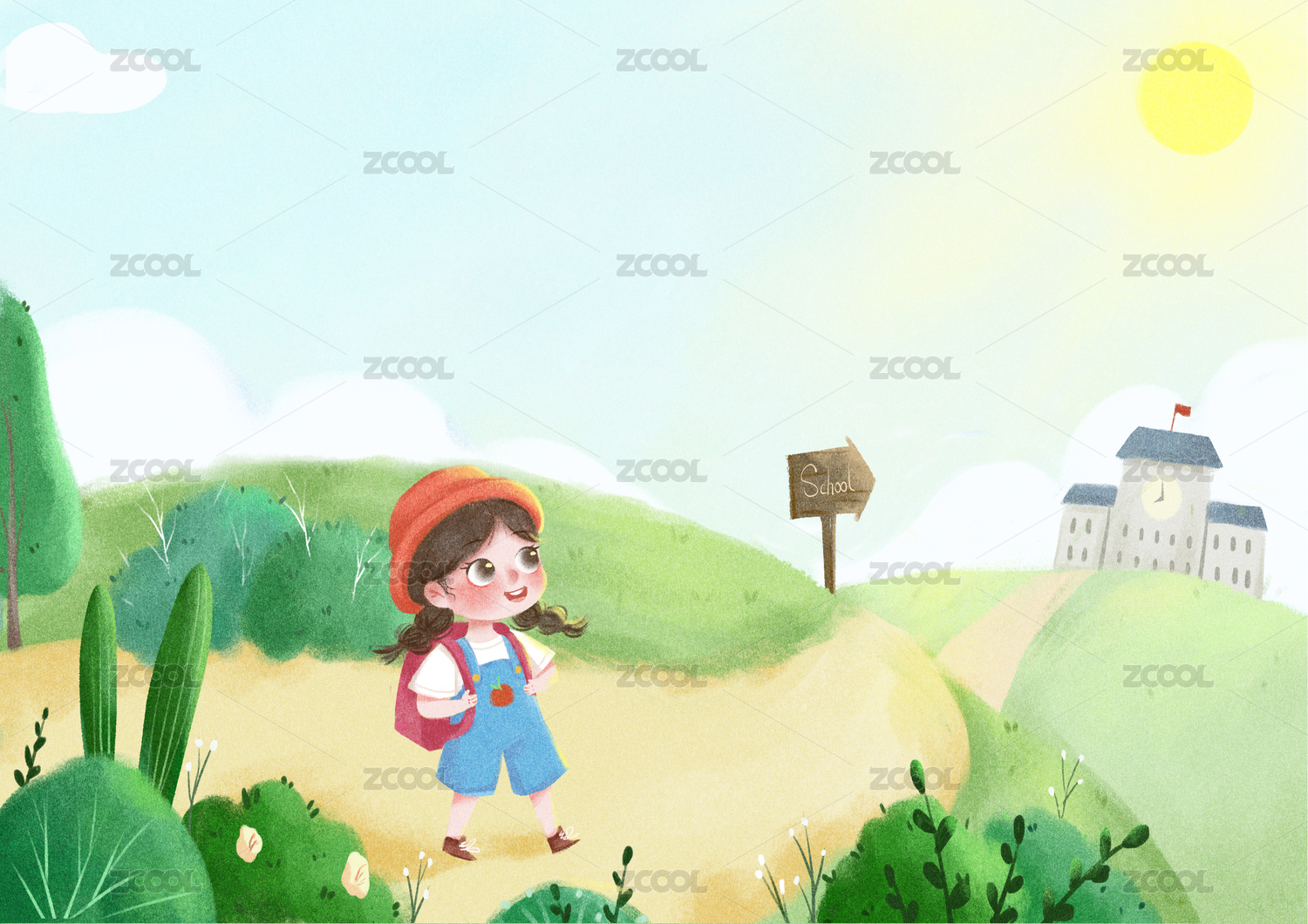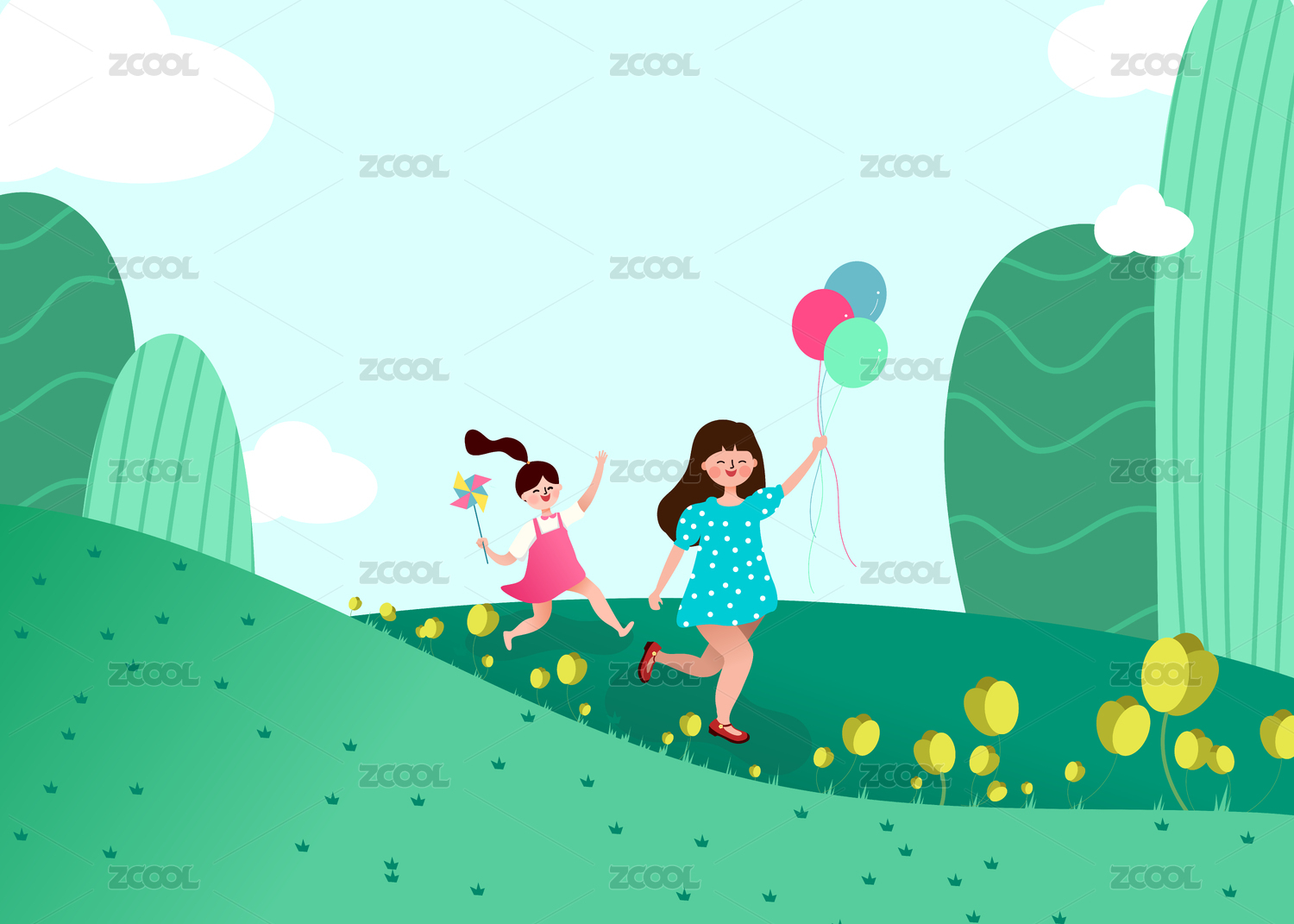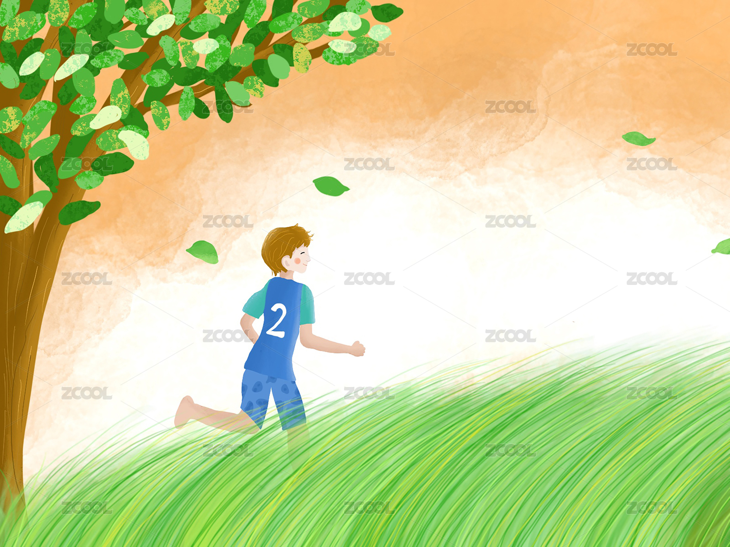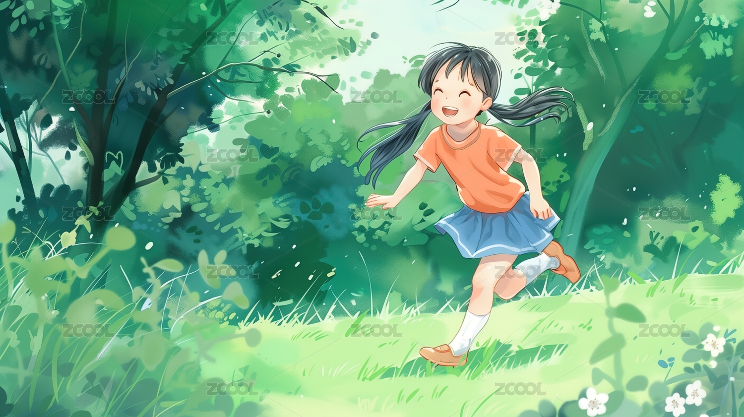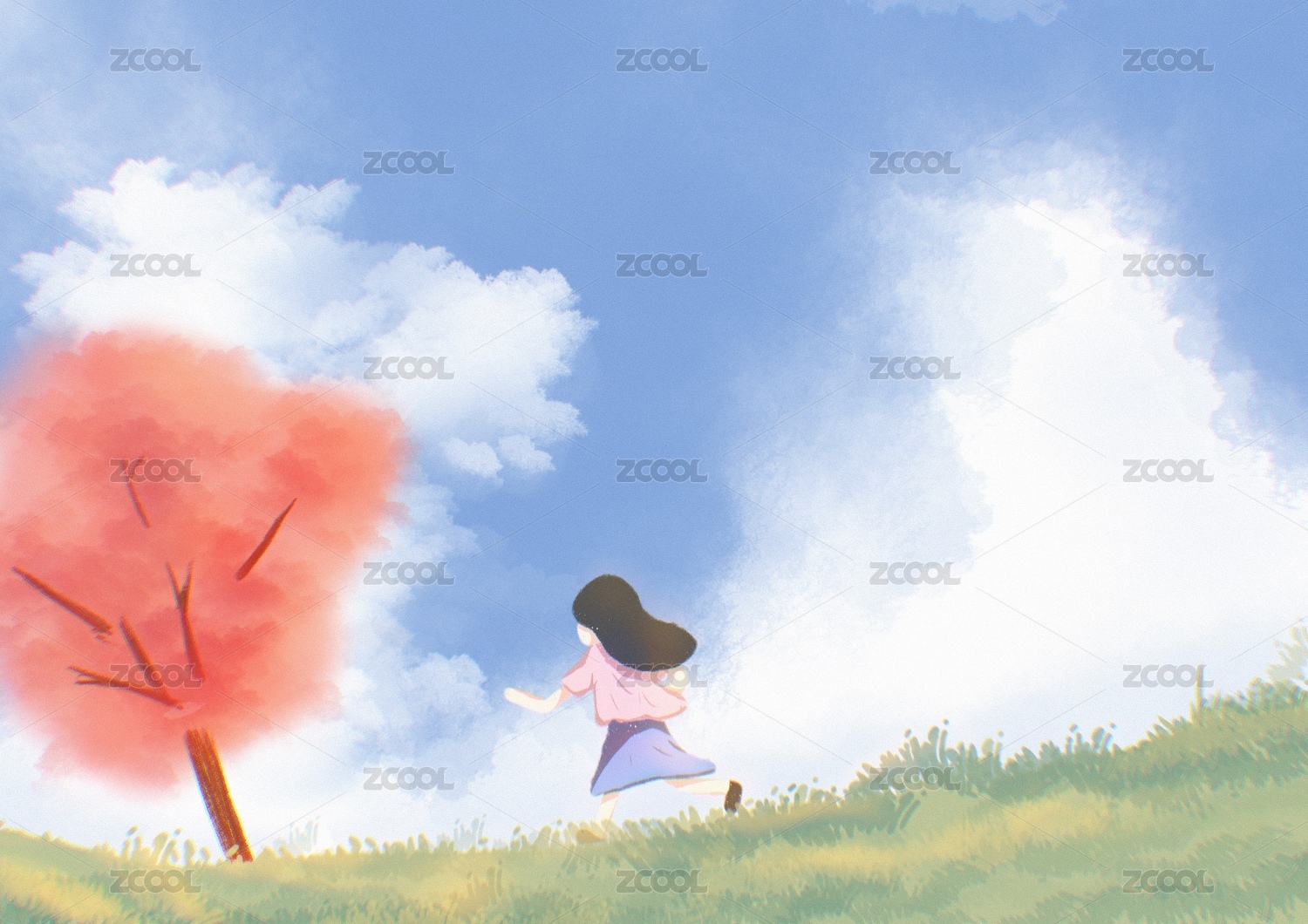 插画女孩跑步户外凉爽春天花草跑道蓝天锻炼