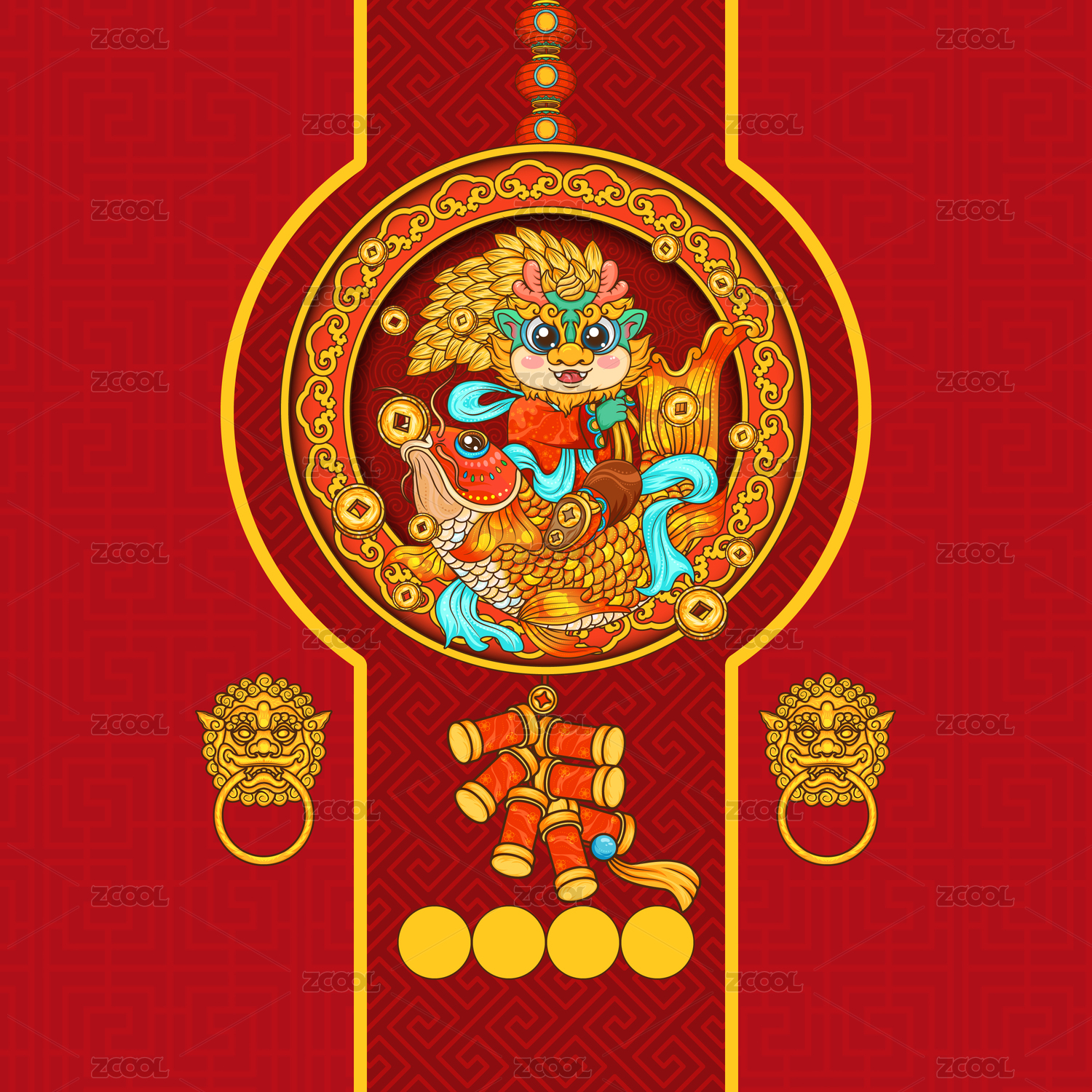 矢量龙年生肖新年春节鲤鱼红包拜年封面背景