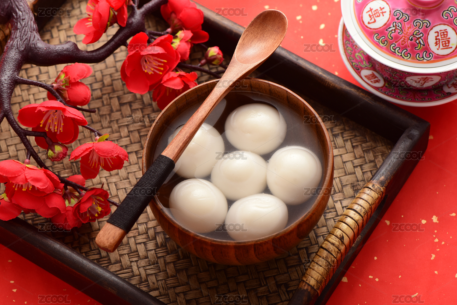 红色背景上的一碗汤圆