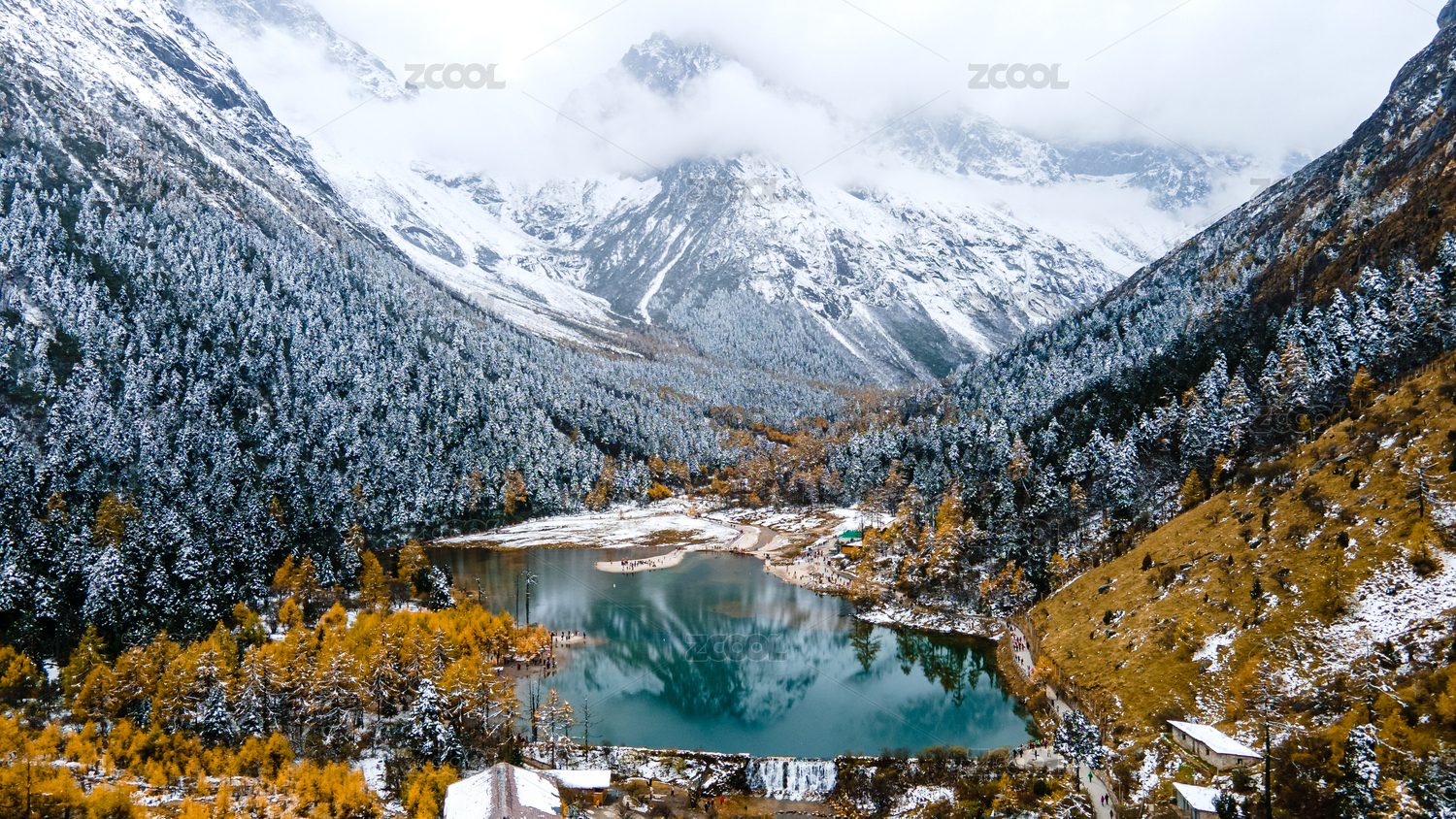 航拍中国四川阿巴州雪后的毕棚沟景区风光
