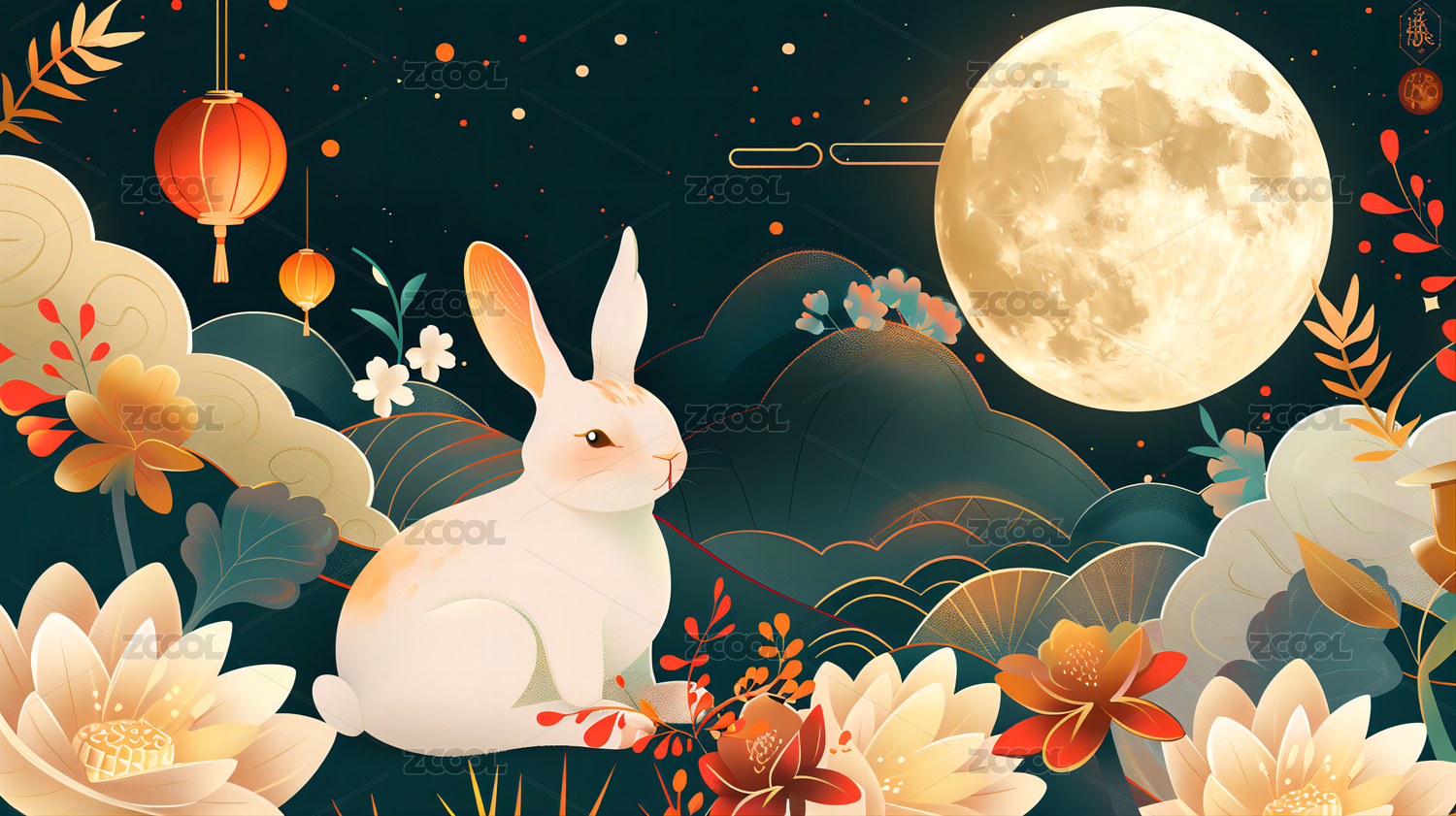 月亮兔子牡丹花中秋节氛围插画月饼包装盒封