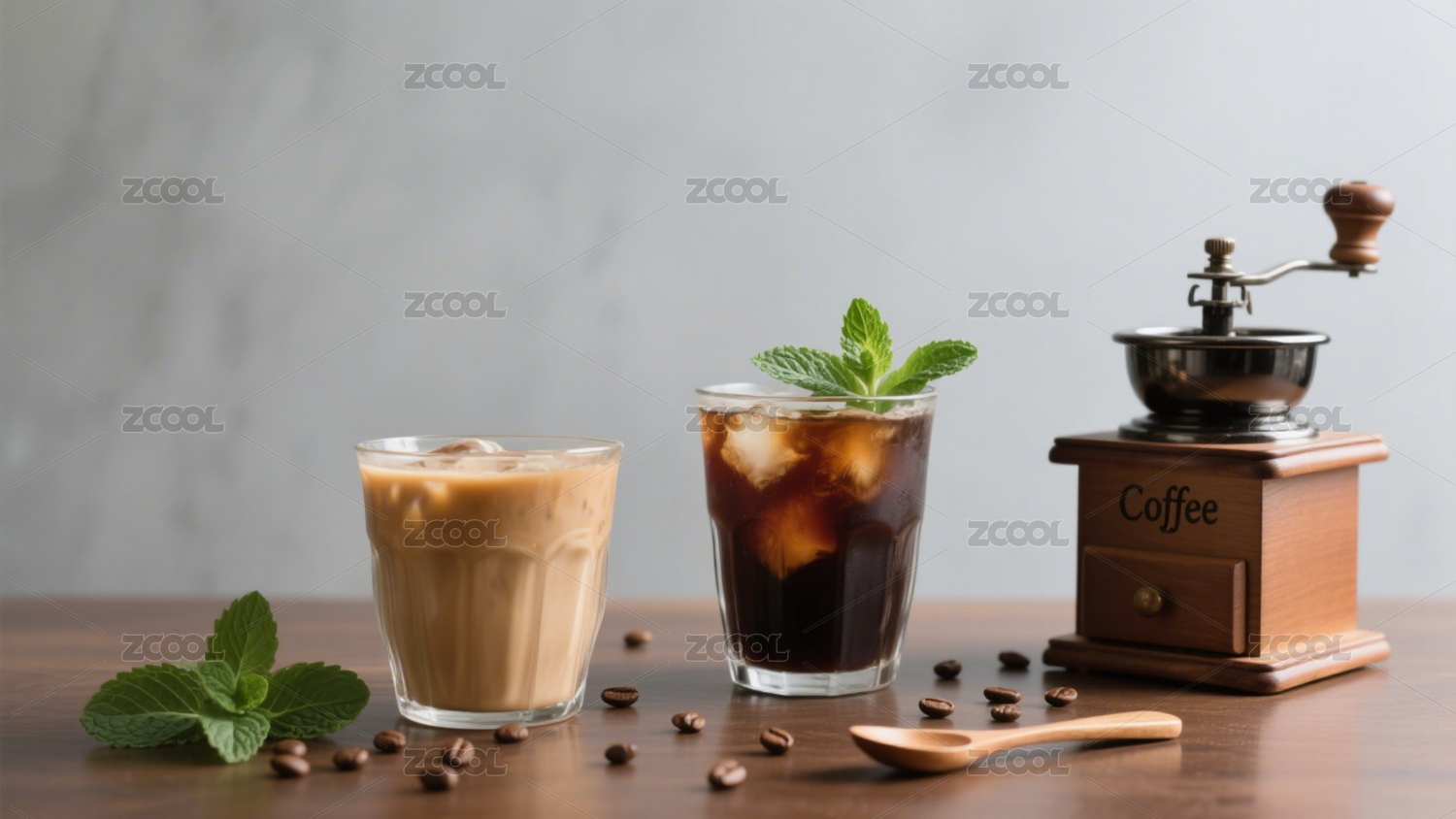 两杯冰咖啡配薄荷与咖啡豆摆拍