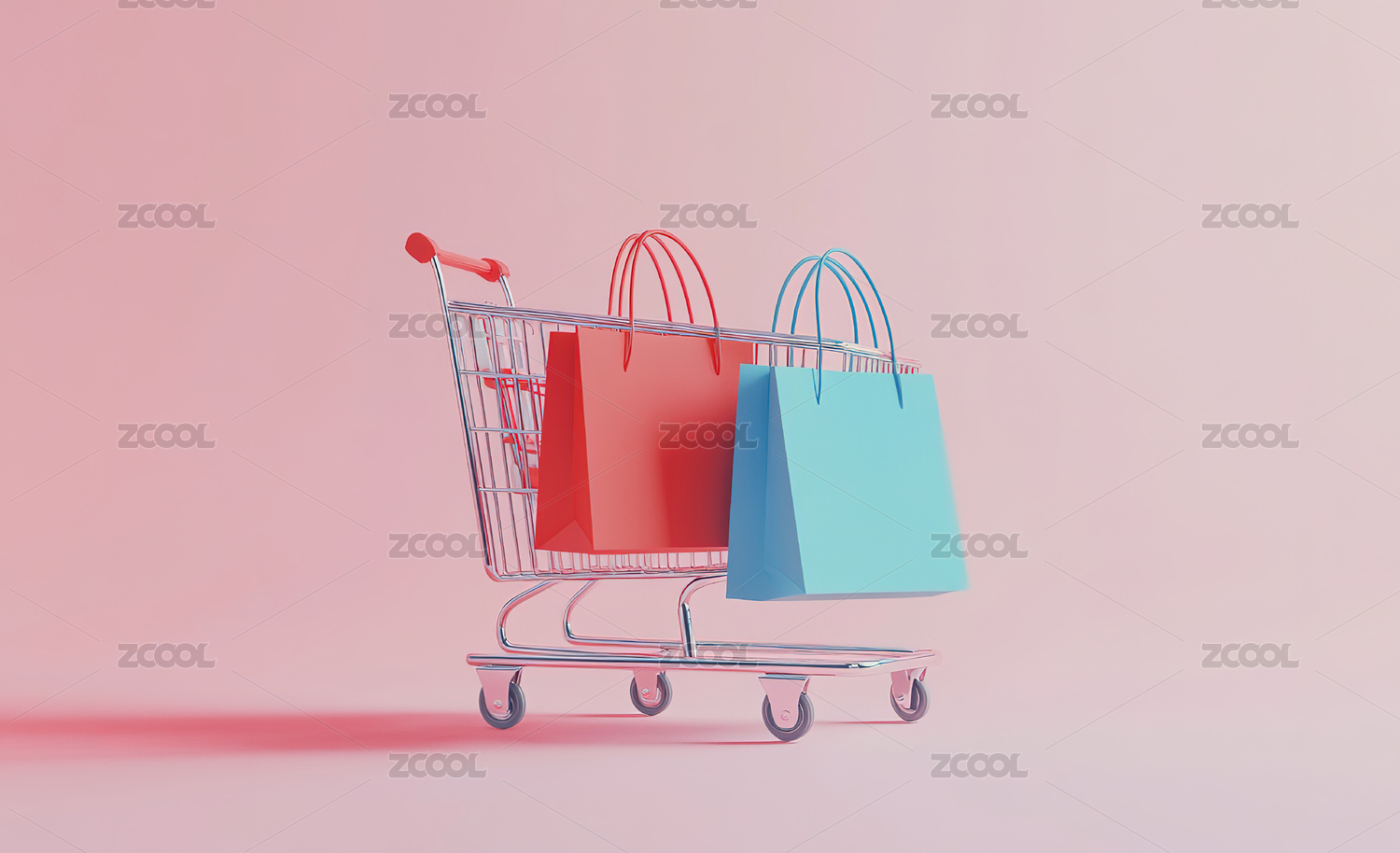 粉红色背景下购物车中彩色购物袋的特写镜头