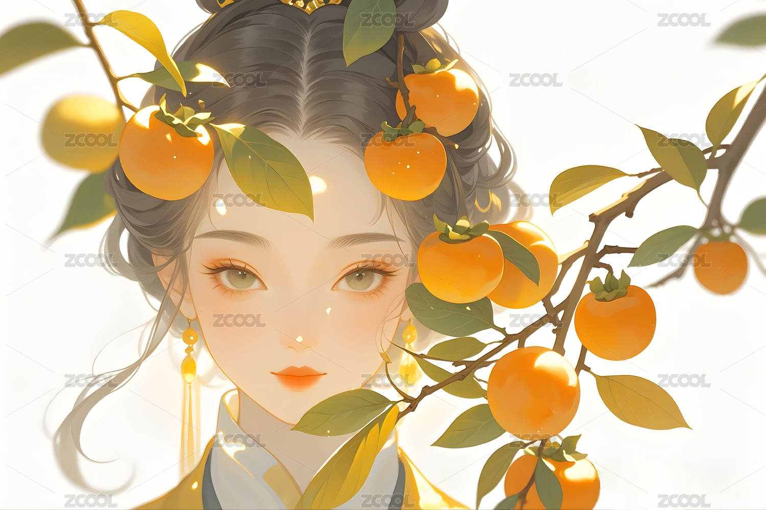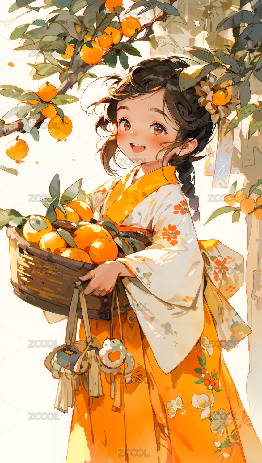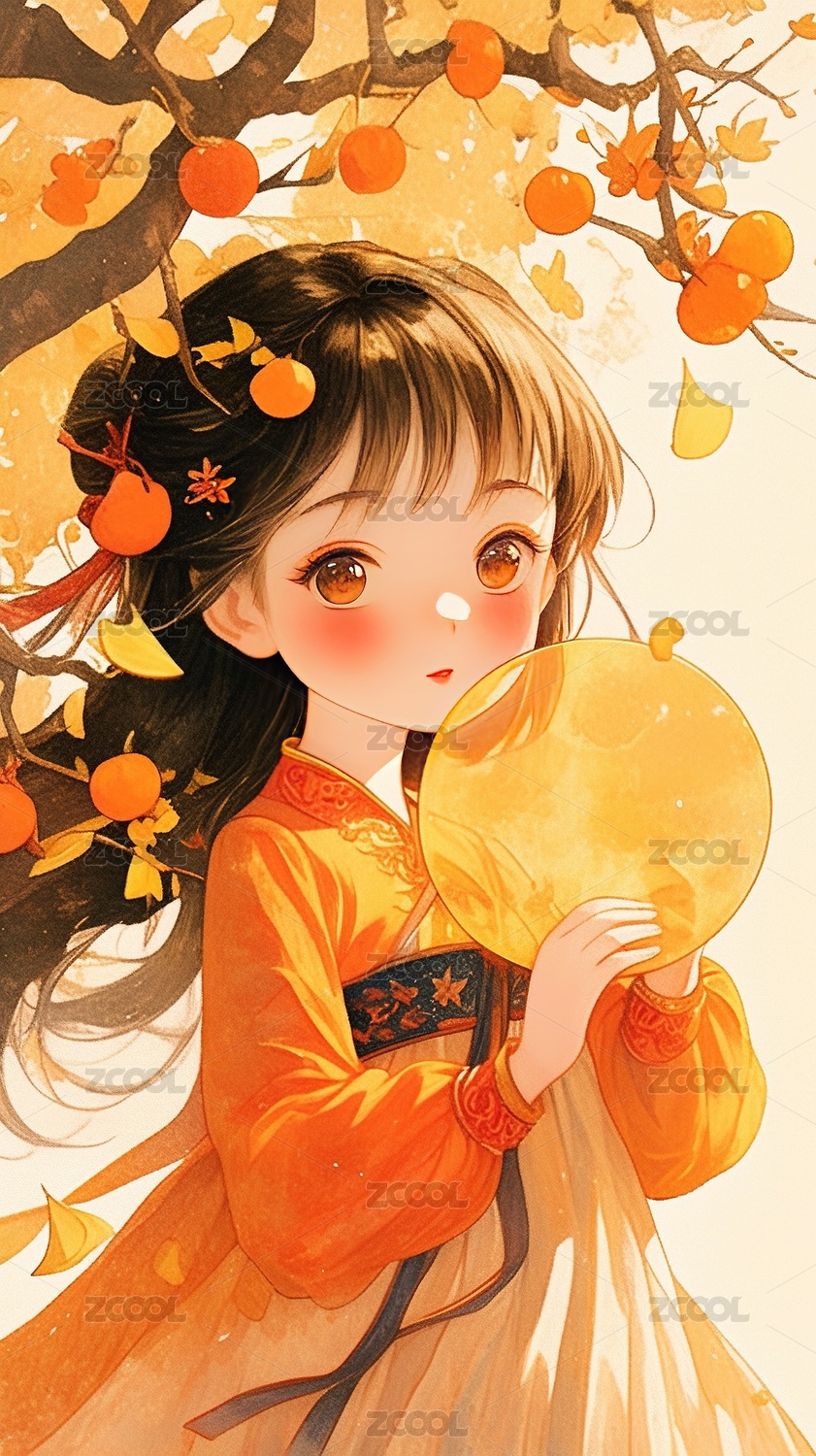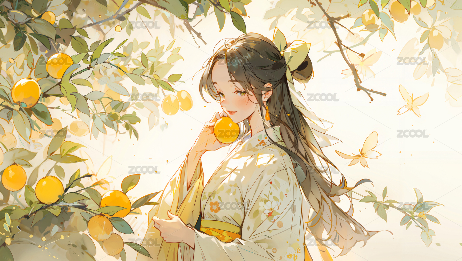 秋天桔子树下可爱的汉服女孩品尝桔子