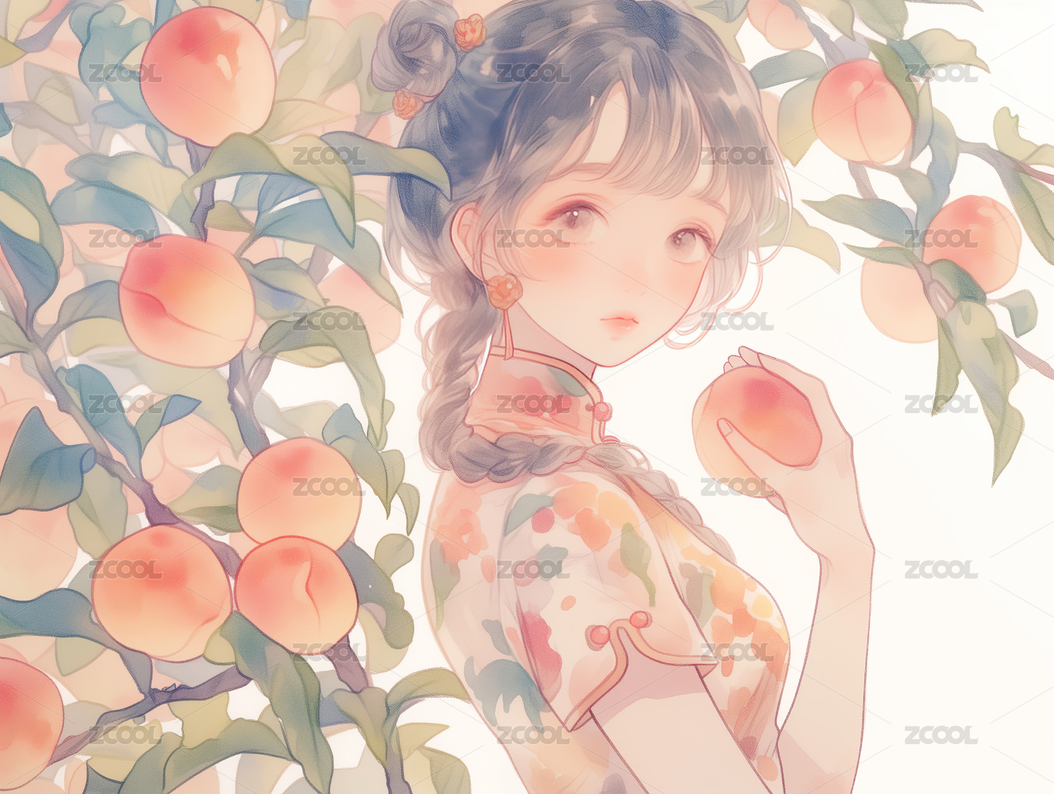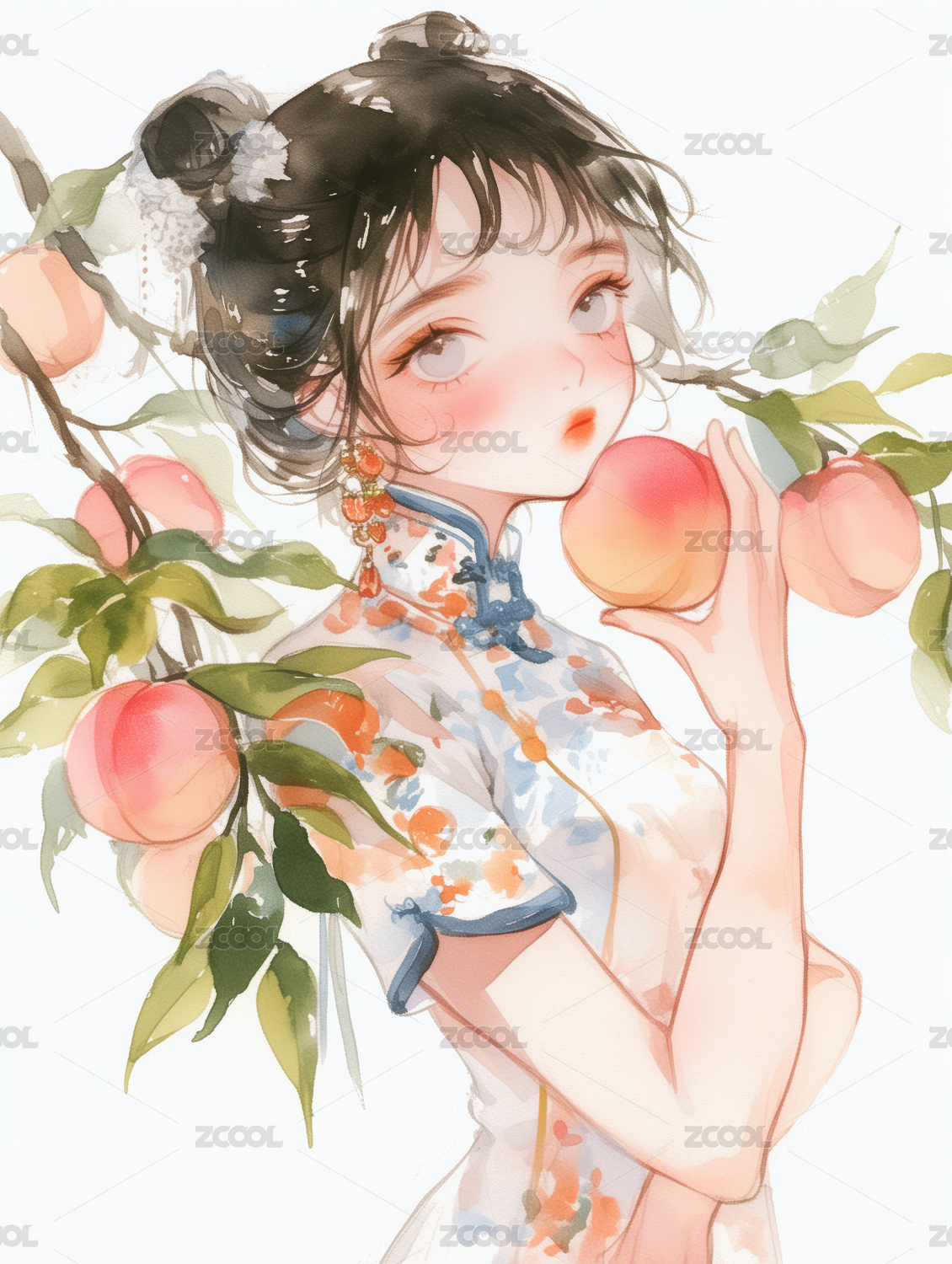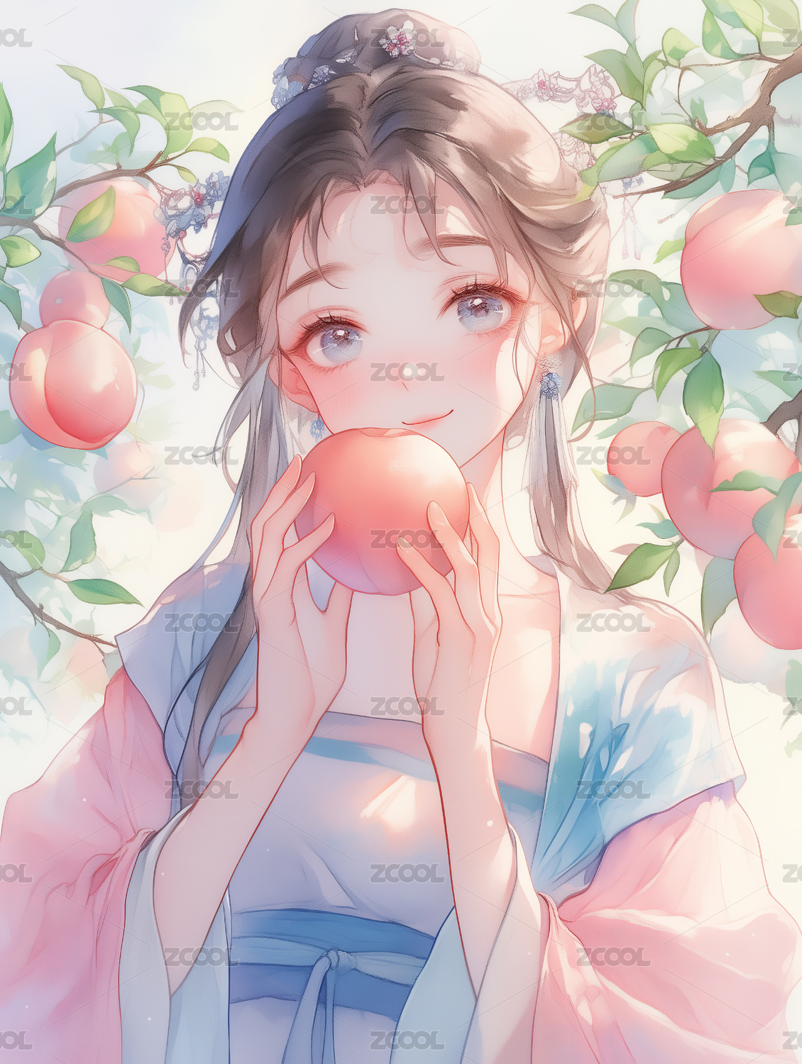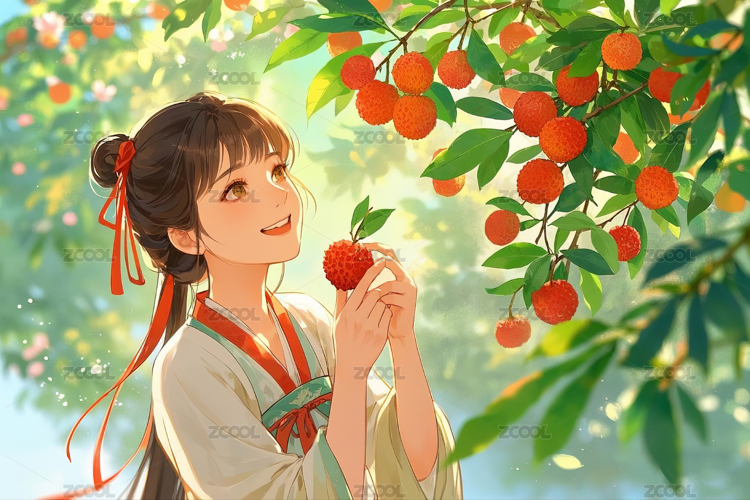 秋天桔子树下可爱的汉服女孩品尝桔子