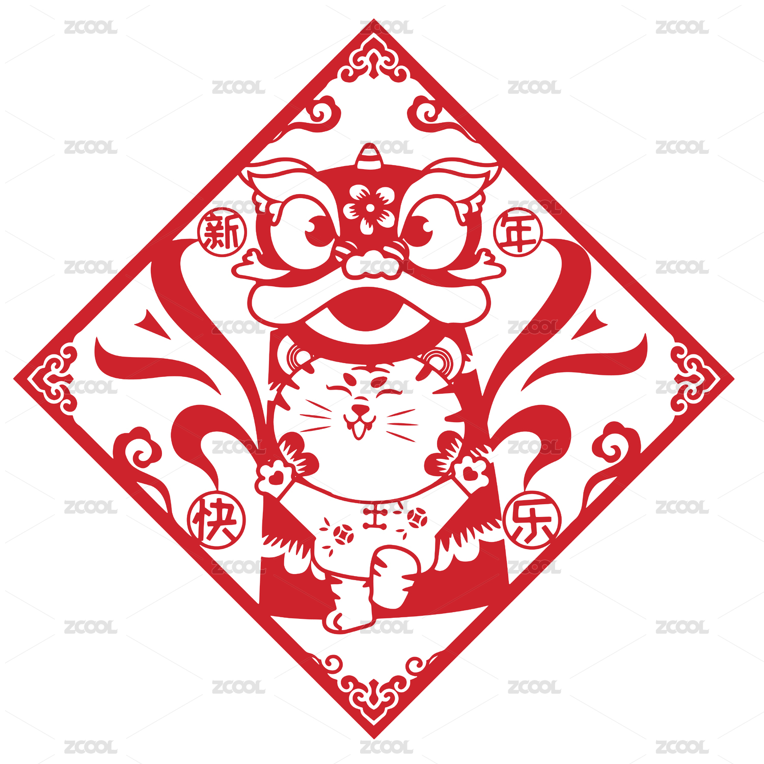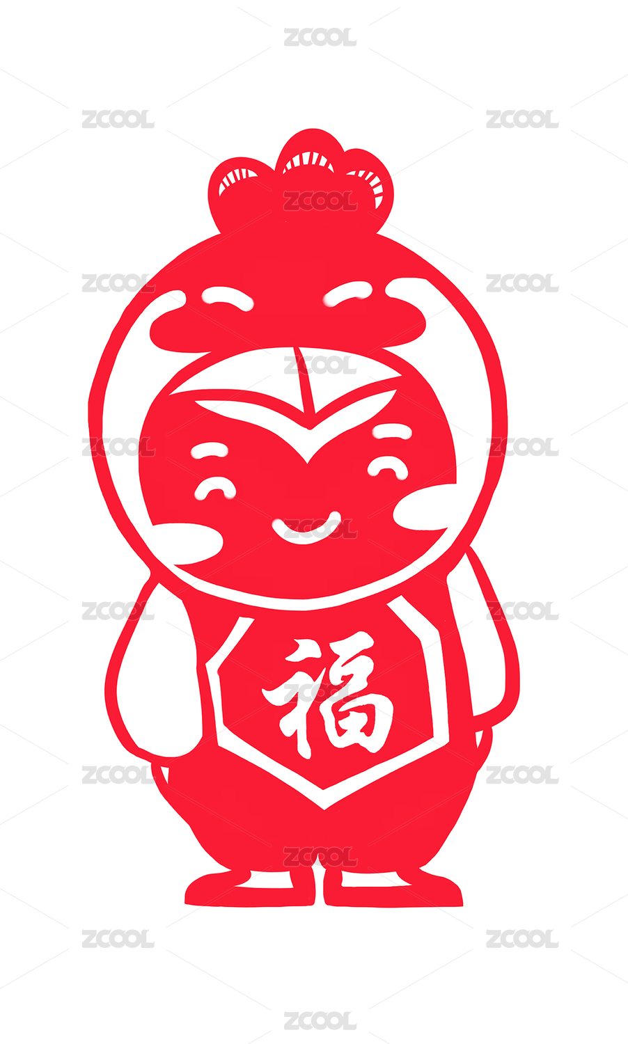 红色吉祥福字年华娃娃抱着兔子祥云剪纸元素