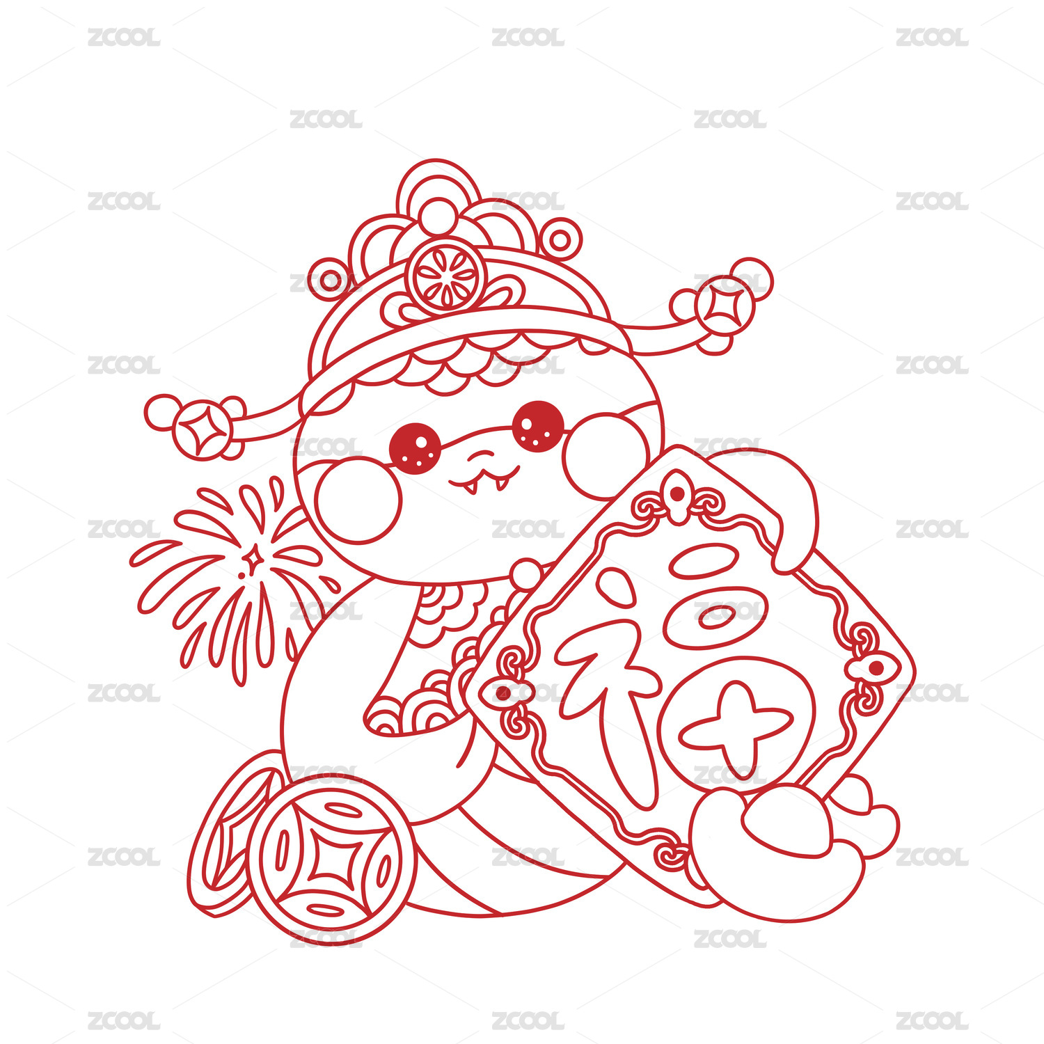 财字,卡通蛇,窗贴,窗花,春节,新年,元宝,钱币,插画