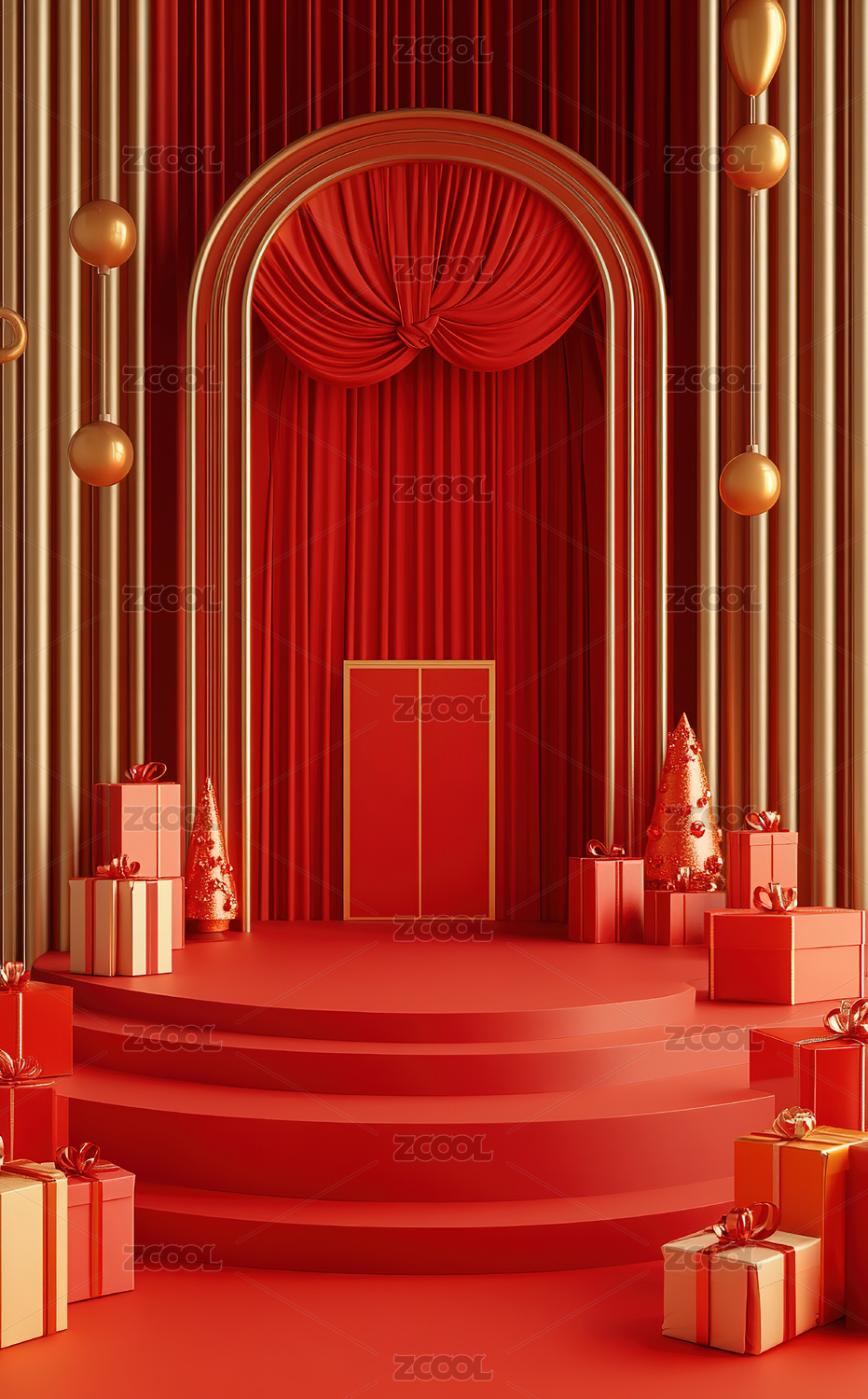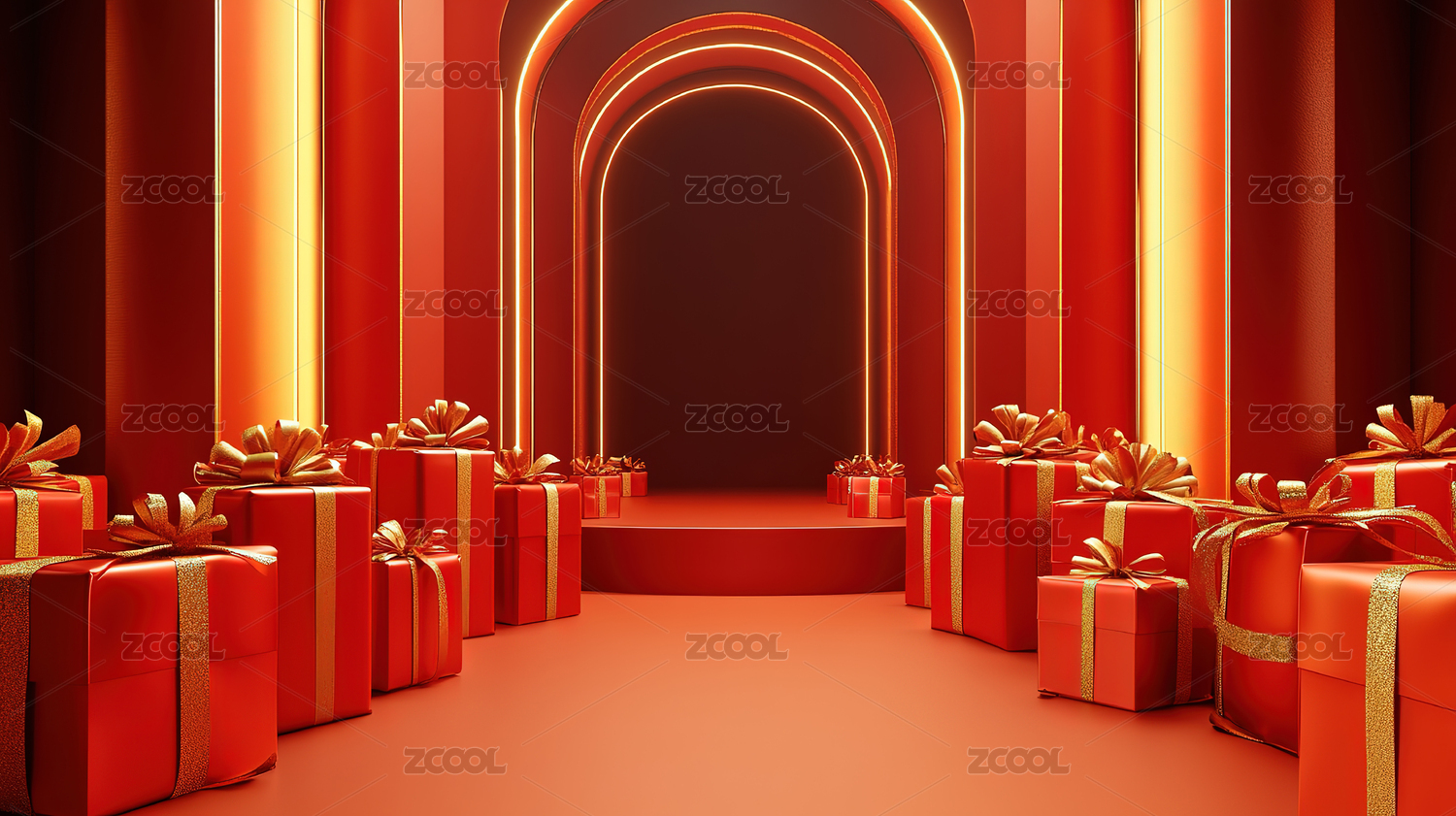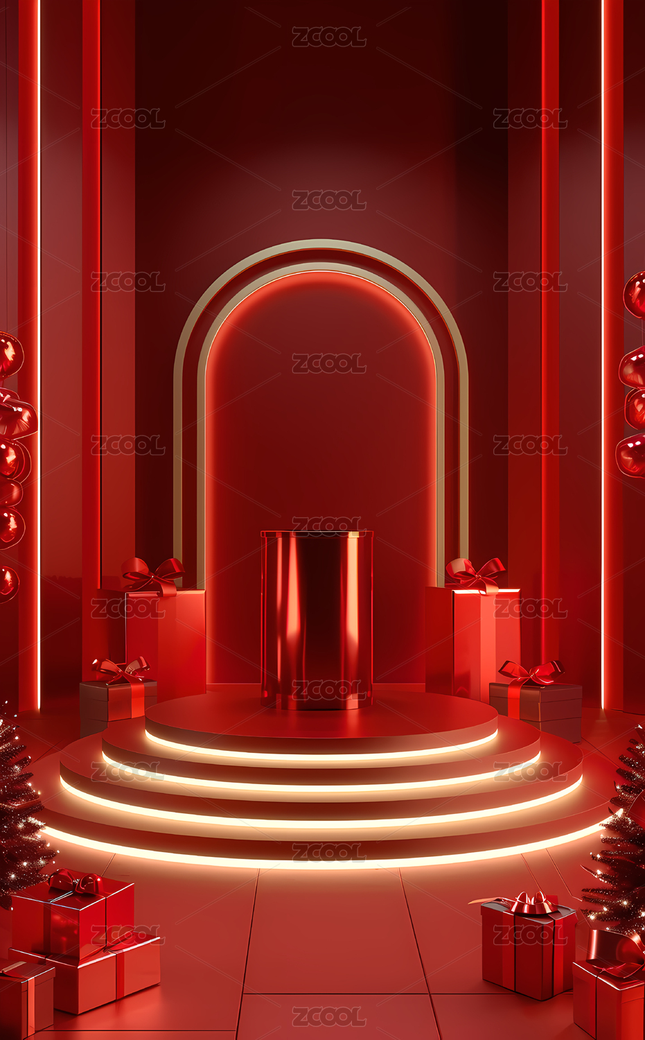 红色舞台与装饰礼物盒