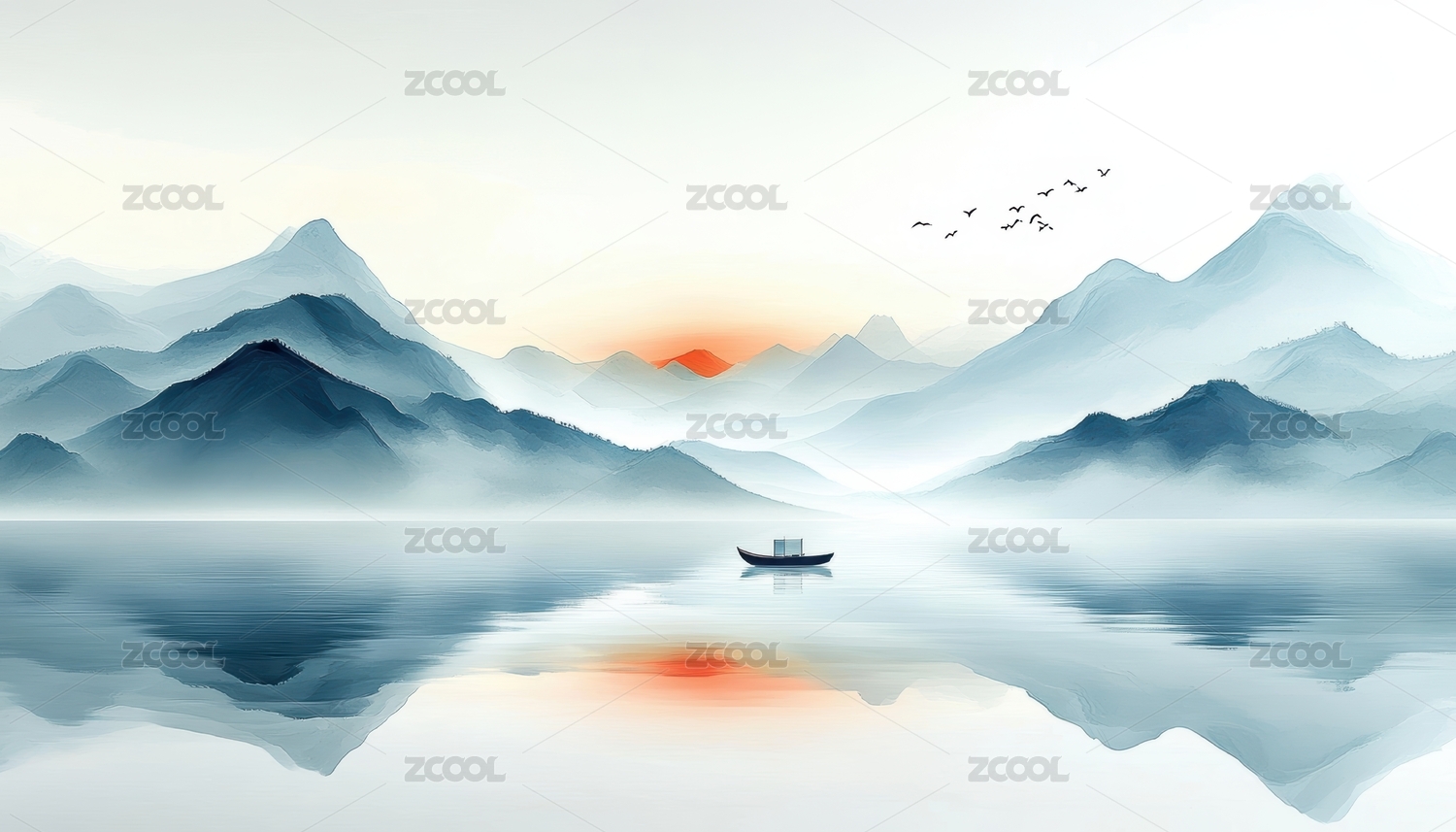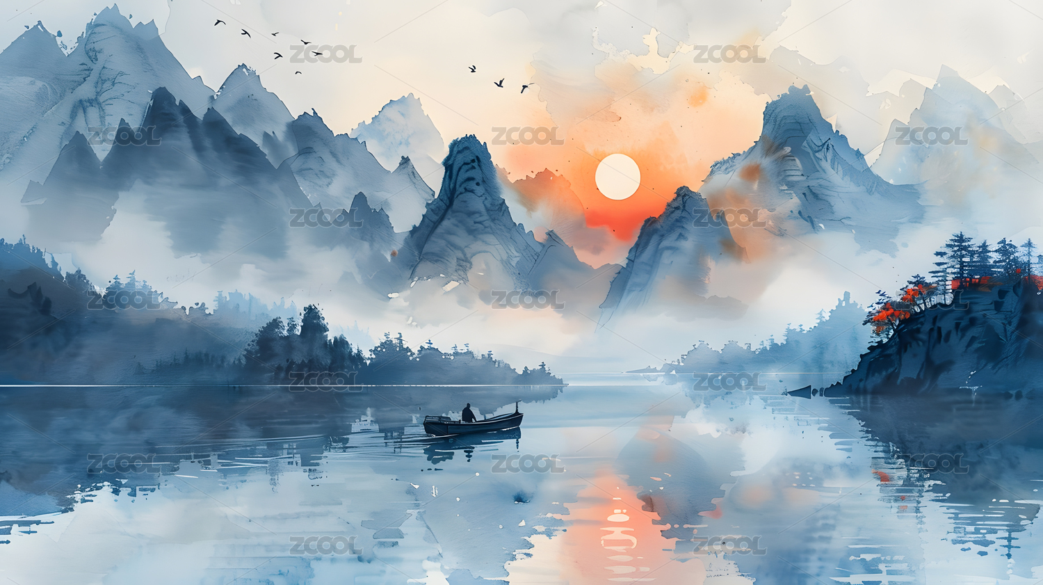 水墨山水间小舟静泊飞鸟掠过