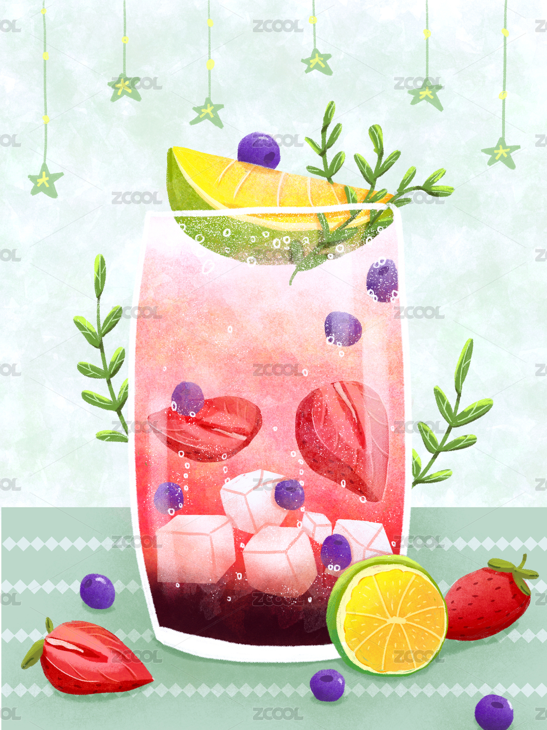 一杯冰镇水果果汁冷饮 手绘插画