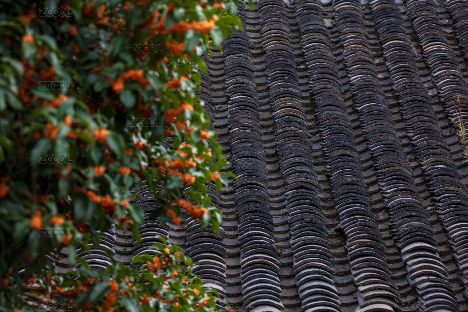 秋天时节乡村瓦屋和金灿灿的银杏树