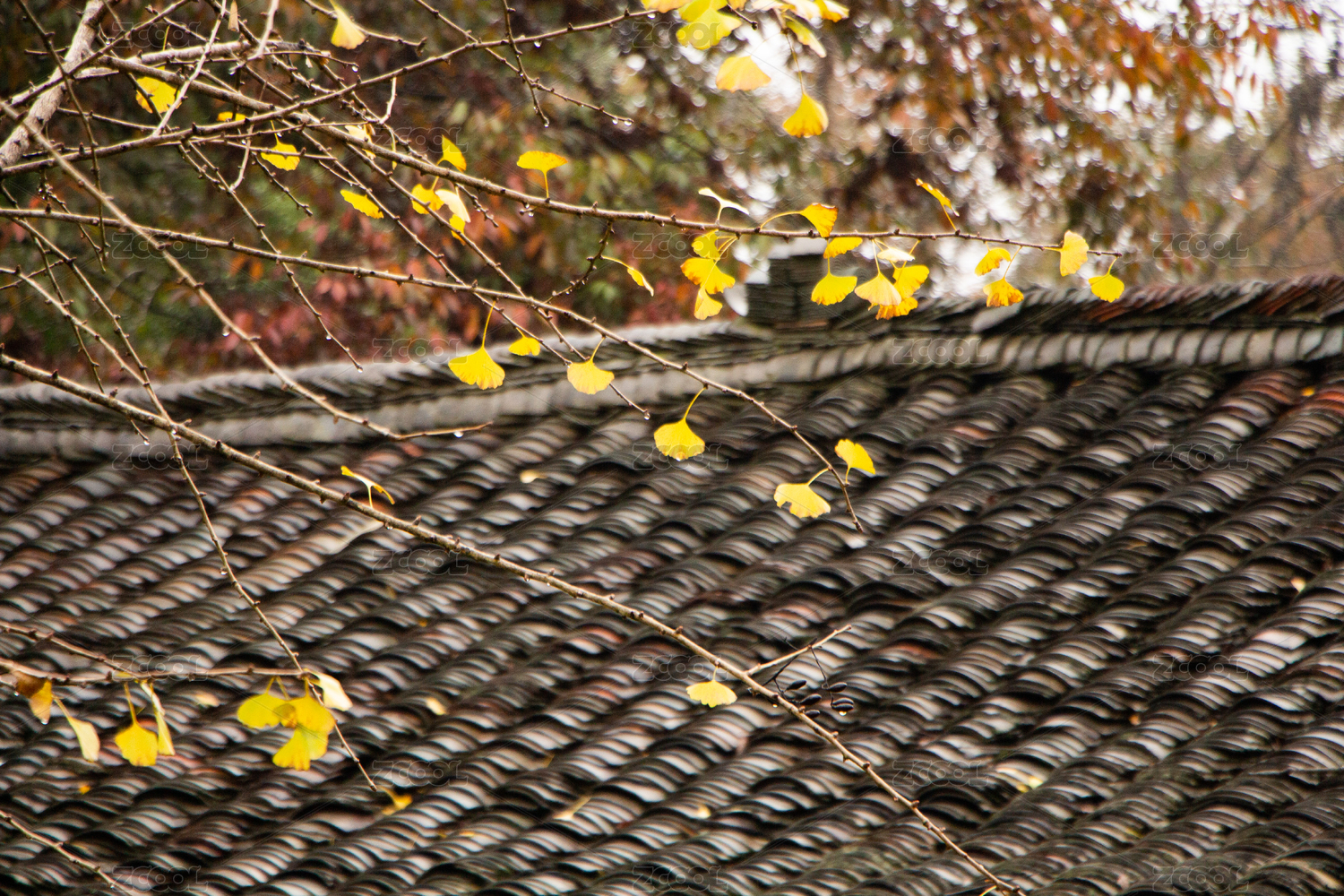 秋天季节瓦屋旁金黄色的银杏树叶子