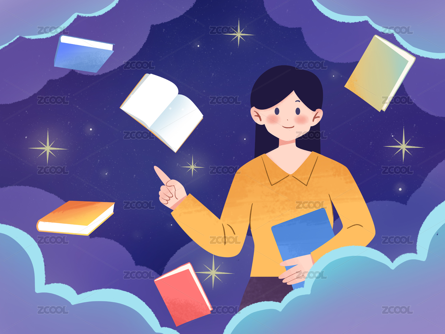 手持书本风中奔跑的女孩读书日蓝色奇幻插画