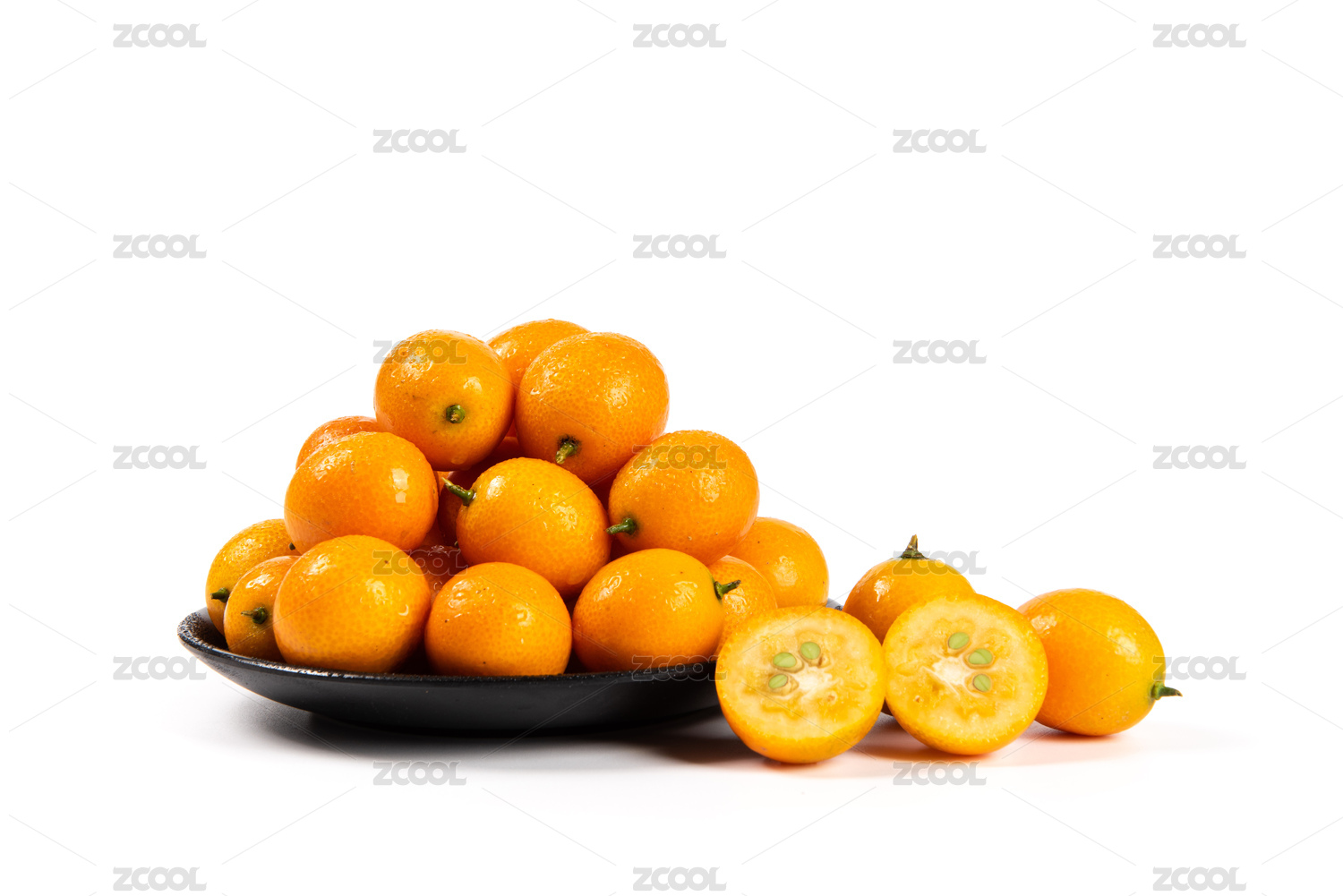 新鲜,叶子,完整,整个,竹筐,切开,盘子,水果,成熟,金桔