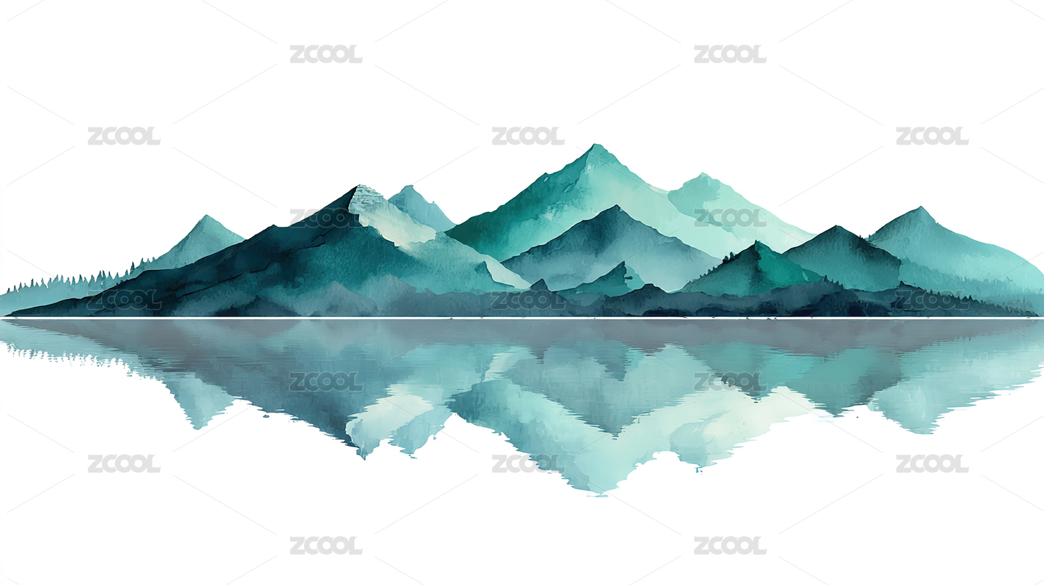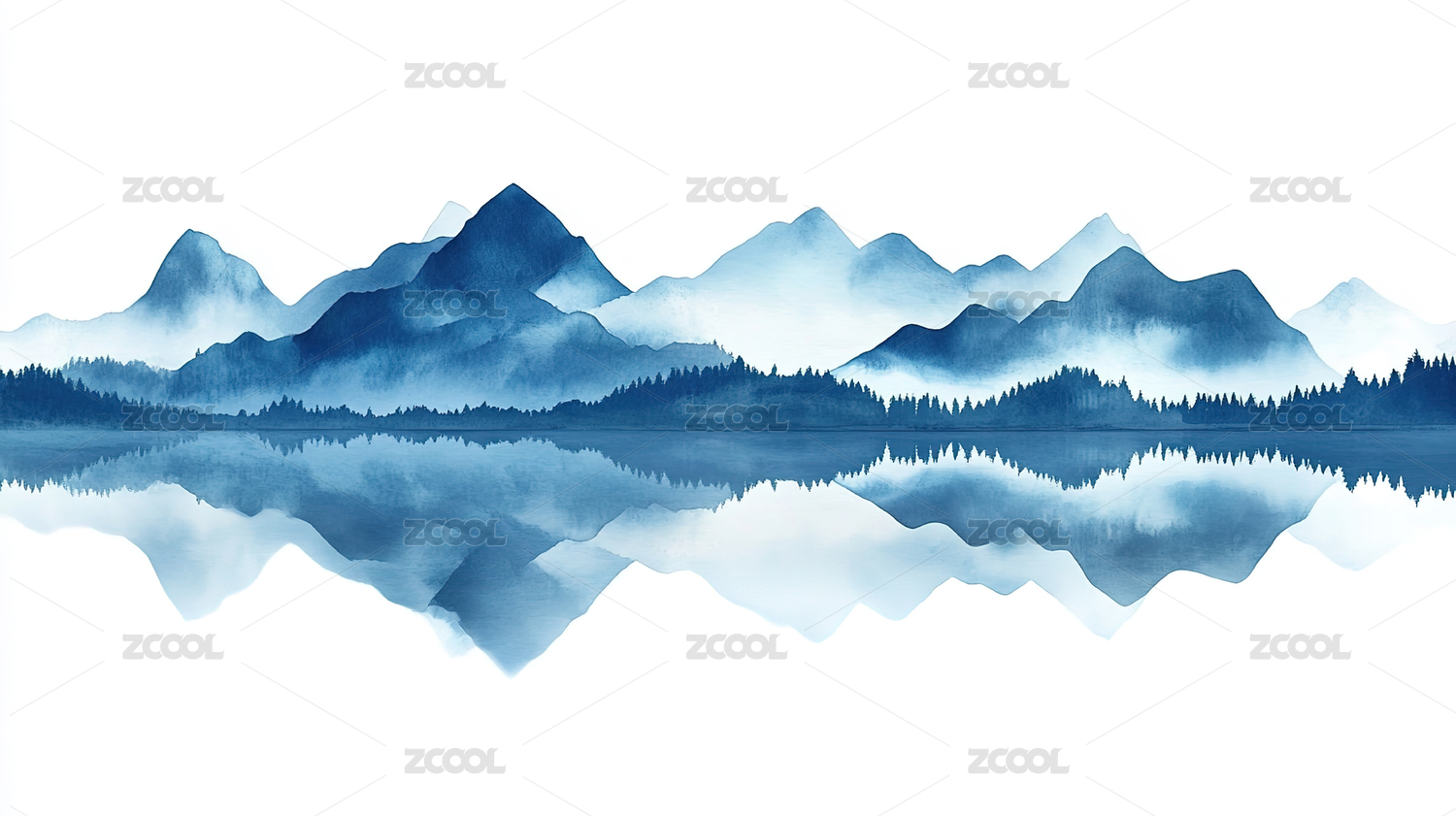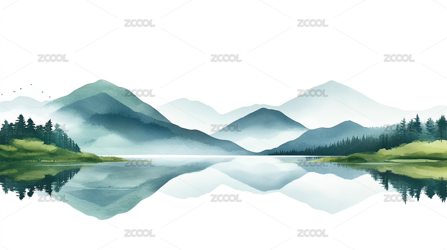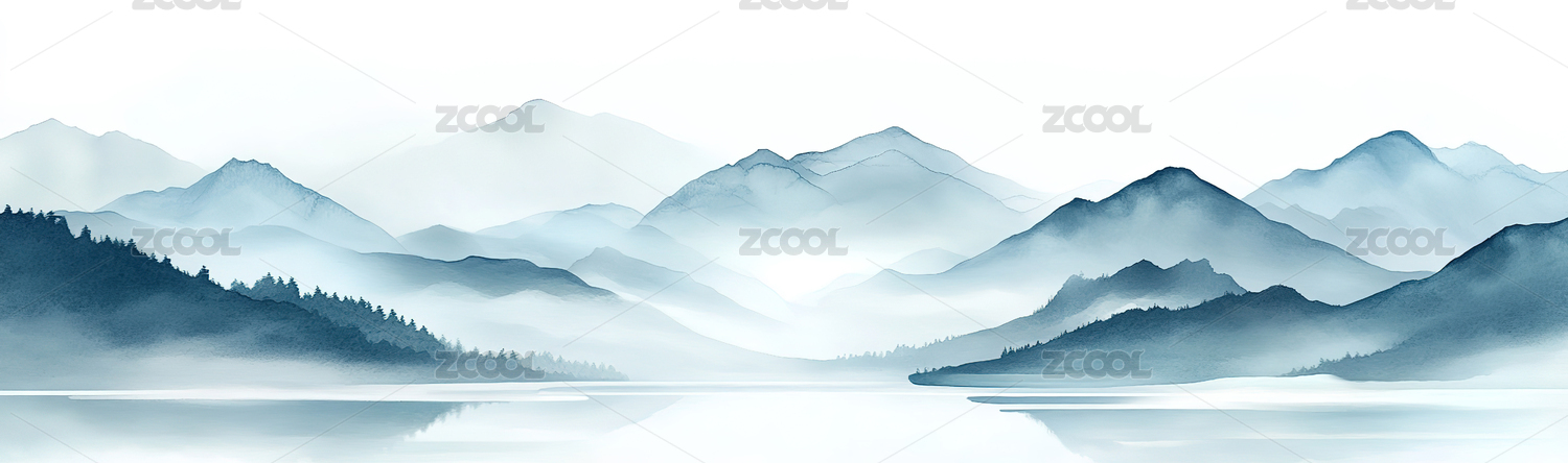 水彩风格山峦湖泊倒影风景绘画,静谧而悠远
