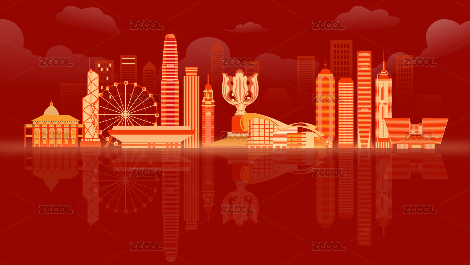 香港城市天际线地标建筑矢量插画背景海报